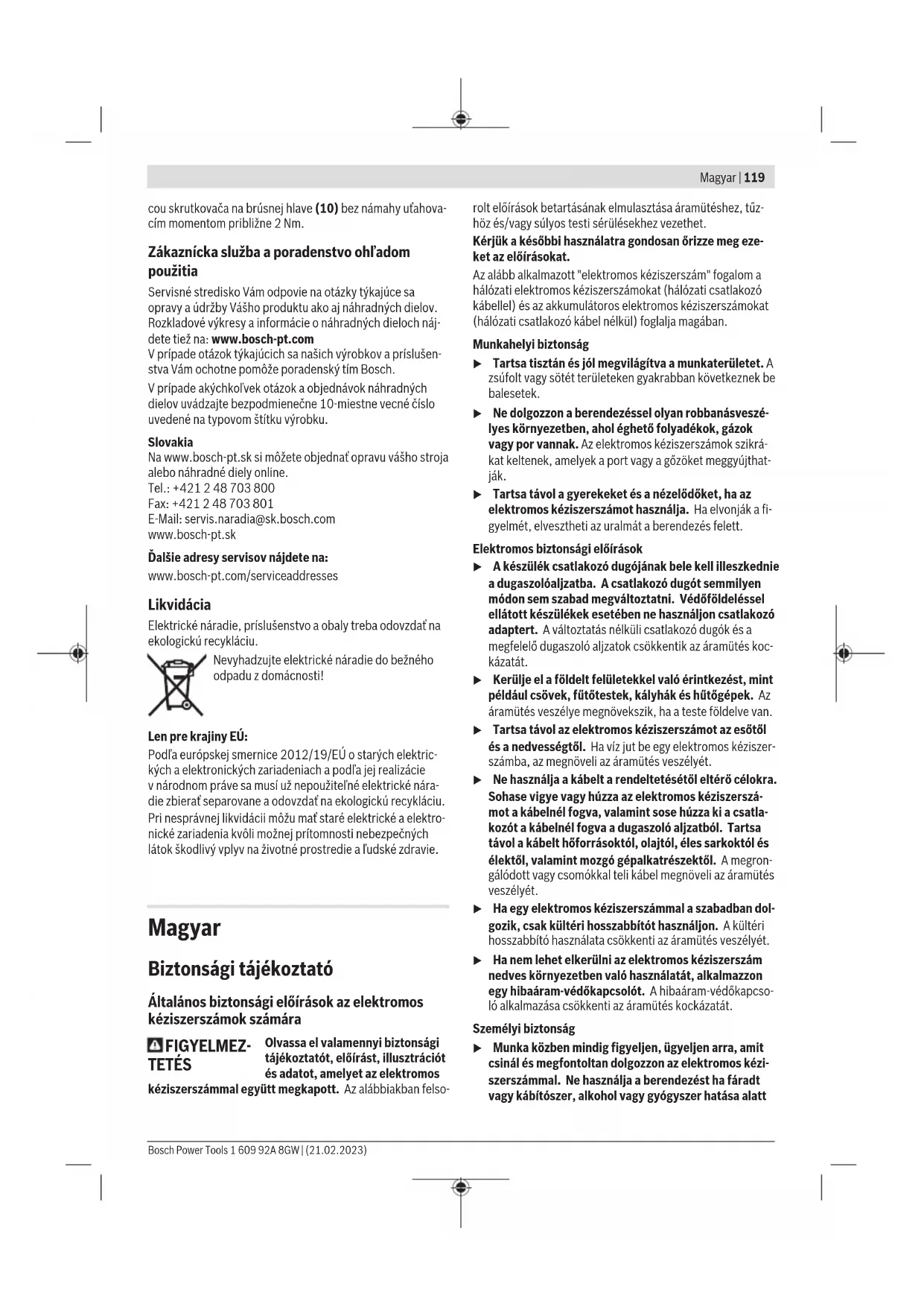 m 1,7 A hosszú változat hossza (2hosszabbítócsővel) m 2,3 Súly az „EPTA-Procedure01:2014” (2014/01 EPTA-eljá- rás) szerint – Rövid változat kg 4,1 – Standard változat kg 4,8 Érintésvédelmi osztály /I A) A standard szállítmány tartalma A adatok 230 V hálózati feszültségre [U] vonatkoznak. Ettől eltérő fe- szültségek és külön egyes országok számára készült kivitelek esetén ezek az adatok változhatnak. Az értékek termékenként változhatnak és függnek az alkalmazási, va- lamint környezeti feltételektől is. További információk a www.bosch-professional.com/wac címen találhatók. Zaj és vibráció értékek A zajkibocsátási értékek aEN62841-2-4szabványnak meg- felelően kerültek meghatározásra. Az elektromos kéziszerszám A-értékelésű zajszintjének tipi- kus értékei: hangnyomásszint87dB(A); hangteljesítményszint95dB(A). A szórás, K=3dB. Bosch Power Tools 1 609 92A 8GW | (21.02.2023)122 | Magyar Viseljen fülvédőt! Az a