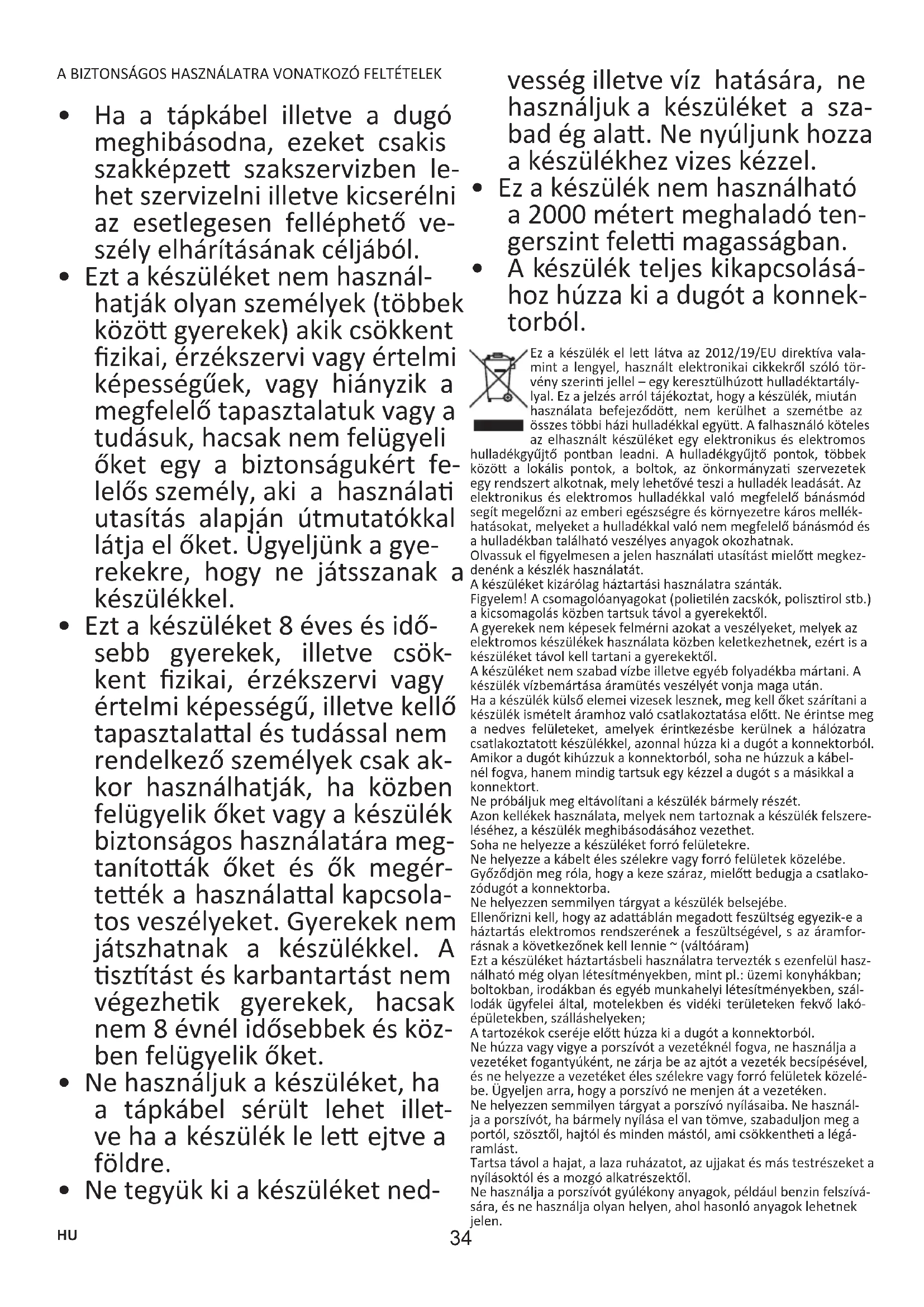 - A készülék teljes kikapcsolásá- hoz húzza ki a dugót a konnek- torból. Ez a készülék el le látva az 2012/19/EU direkva vala- mint a lengyel, használt elektronikai cikkekről szóló tör- vény szerin jellel – egy keresztülhúzo hulladéktartály- lyal. Ez a jelzés arról tájékoztat, hogy a készülék, miután használata befejeződö, nem kerülhet a szemétbe az összes többi házi hulladékkal együ. A falhasználó köteles az elhasznált készüléket egy elektronikus és elektromos hulladékgyűjtő pontban leadni. A hulladékgyűjtő pontok, többek közö a lokális pontok, a boltok, az önkormányza szervezetek egy rendszert alkotnak, mely lehetővé teszi a hulladék leadását. Az elektronikus és elektromos hulladékkal való megfelelő bánásmód segít megelőzni az emberi egészségre és környezetre káros mellék- hatásokat, melyeket a hulladékkal való nem megfelelő bánásmód és a hulladékban található veszélyes anyagok okozhatnak. Olvassuk el gyelmesen a jelen használa utasítást mielő megkez- denénk a készlék használatát. A készüléket kizárólag háztartási használatra szánták. Figyelem! A csomagolóanyagokat (polielén zacskók, poliszrol stb.) a kicsomagolás közben tartsuk távol a gyerekektől. A gyerekek nem képesek felmérni azokat a veszélyeket, melyek az elektromos készülékek használata közben keletkezhetnek, ezért is a készüléket távol kell tartani a gyerekektől. A készüléket nem szabad vízbe illetve egyéb folyadékba mártani. A készülék vízbemártása áramütés veszélyét vonja maga után. Ha a készülék külső elemei vizesek lesznek, meg kell őket szárítani a készülék ismételt áramhoz való csatlakoztatása elő. Ne érintse meg a nedves felületeket, amelyek érintkezésbe kerülnek a hálózatra csatlakoztato készülékkel, azonnal húzza ki a dugót a konnektorból. Amikor a dugót kihúzzuk a konnektorból, soha ne húzzuk a kábel- nél fogva, hanem mindig tartsuk egy kézzel a dugót s a másikkal a konnektort. Ne próbáljuk meg eltávolítani a készülék bármely részét. Azon kellékek használata, melyek nem tartoznak a készülék felszere- léséhez, a készülék meghibásodásához vezethet. Soha ne helyezze a készüléket forró felületekre. Ne helyezze a kábelt éles szélekre vagy forró felületek közelébe. Győződjön meg róla, hogy a keze száraz, mielő bedugja a csatlako- zódugót a konnektorba. Ne helyezzen semmilyen tárgyat a készülék belsejébe. Ellenőrizni kell, hogy az adaáblán megado feszültség egyezike a háztartás elektromos rendszerének a feszültségével, s az áramfor- rásnak a következőnek kell lennie ~ (váltóáram) Ezt a készüléket háztartásbeli használatra tervezték s ezenfelül hasz- nálható még olyan létesítményekben, mint pl.: üzemi konyhákban; boltokban, irodákban és egyéb munkahelyi létesítményekben, szál- lodák ügyfelei által, motelekben és vidéki területeken fekvő lakó- épületekben, szálláshelyeken; A tartozékok cseréje elő húzza ki a dugót a konnektorból. Ne húzza vagy vigye a porszívót a vezetéknél fogva, ne használja a vezetéket fogantyúként, ne zárja be az ajtót a vezeték becsípésével, és ne helyezze a vezetéket éles szélekre vagy forró felületek közelé- be. Ügyeljen arra, hogy a porszívó ne menjen át a vezetéken. Ne helyezzen semmilyen tárgyat a porszívó nyílásaiba. Ne használ- ja a porszívót, ha bármely nyílása el van tömve, szabaduljon meg a portól, szösztől, hajtól és minden mástól, ami csökkenthe a légá- ramlást. Tartsa távol a hajat, a laza ruházatot, az ujjakat és más testrészeket a nyílásoktól és a mozgó alkatrészektől. Ne használja a porszívót gyúlékony anyagok, például benzin felszívá- sára, és ne használja olyan helyen, ahol hasonló anyagok lehetnek jelen.35