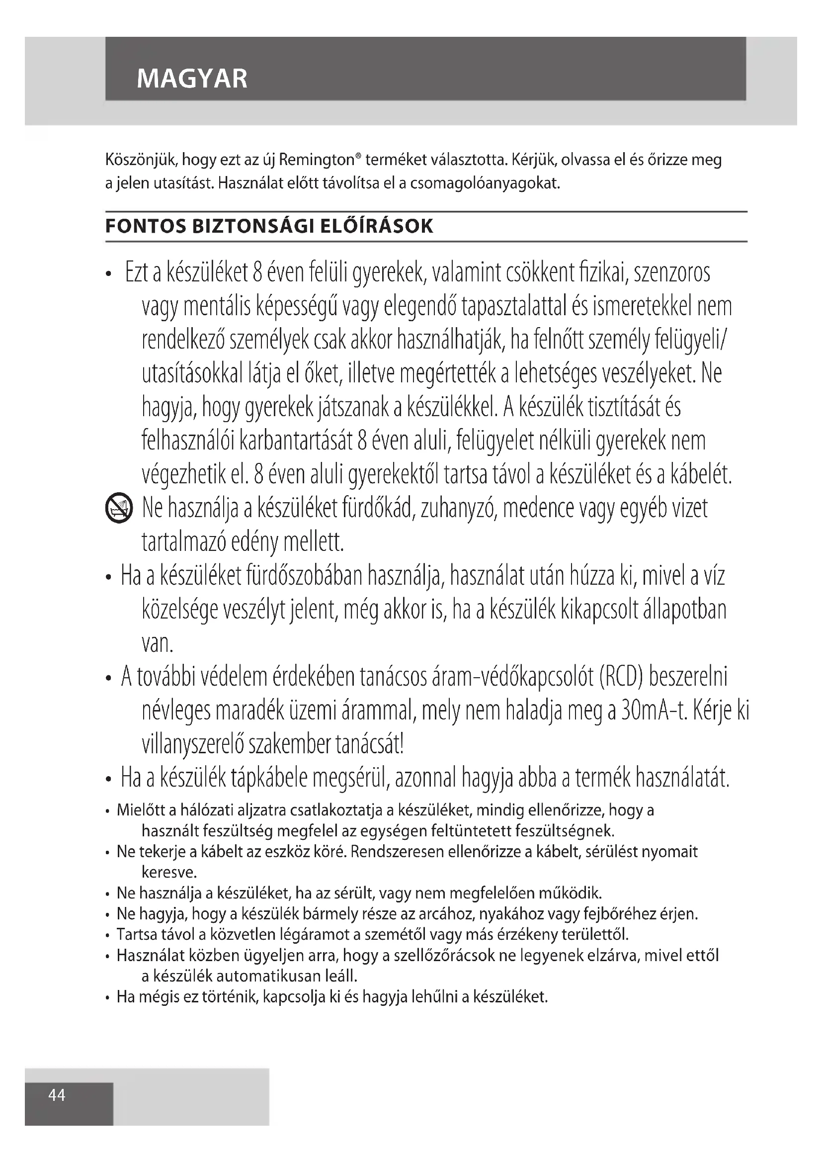 AE44 Köszönjük, hogy ezt az új Remington® terméket választotta. Kérjük, olvassa el és őrizze meg a jelen utasítást. Használat előtt távolítsa el a csomagolóanyagokat.