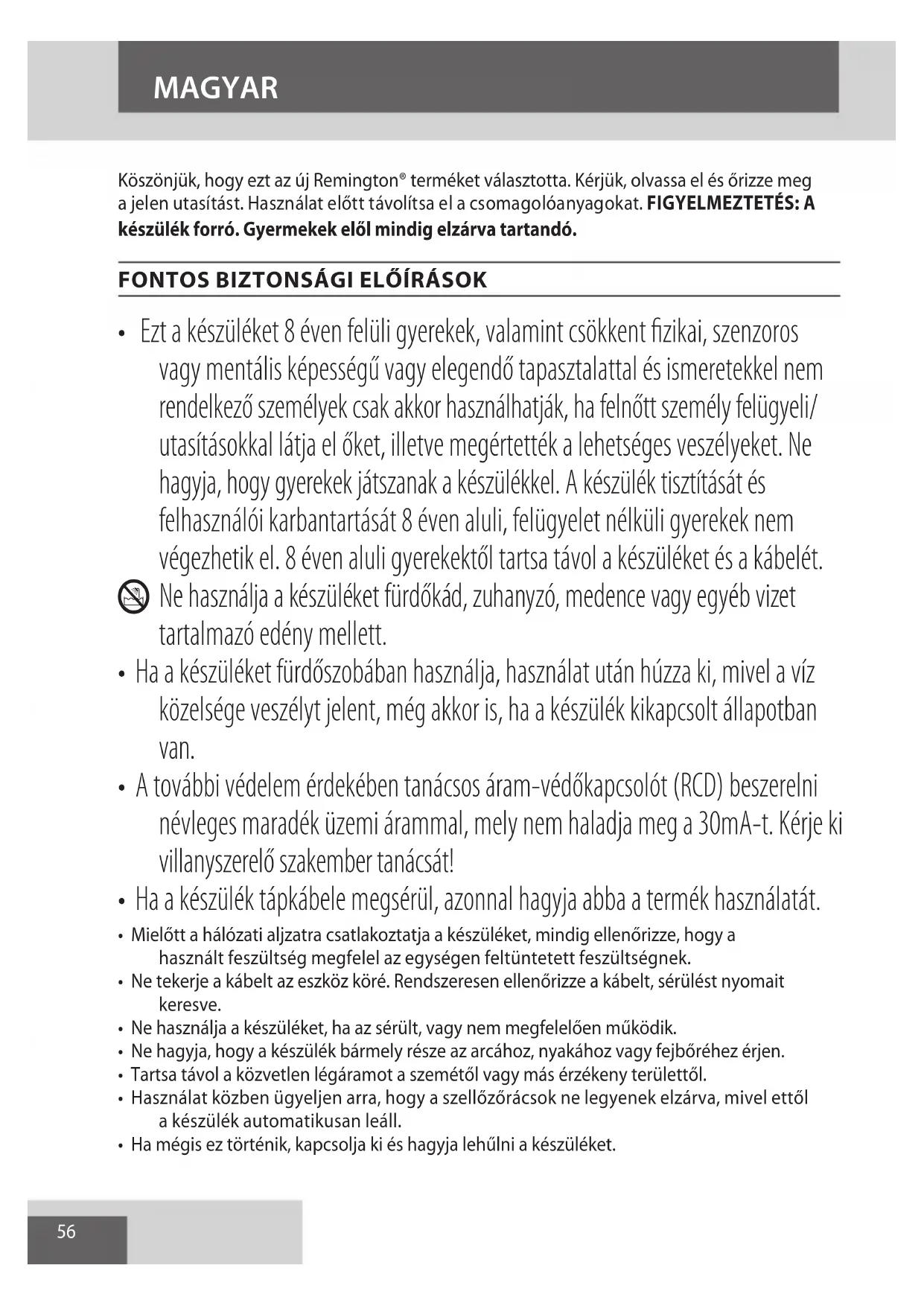 AE56 Köszönjük, hogy ezt az új Remington® terméket választotta. Kérjük, olvassa el és őrizze meg a jelen utasítást. Használat előtt távolítsa el a csomagolóanyagokat. FIGYELMEZTETÉS: A készülék forró. Gyermekek elől mindig elzárva tartandó.