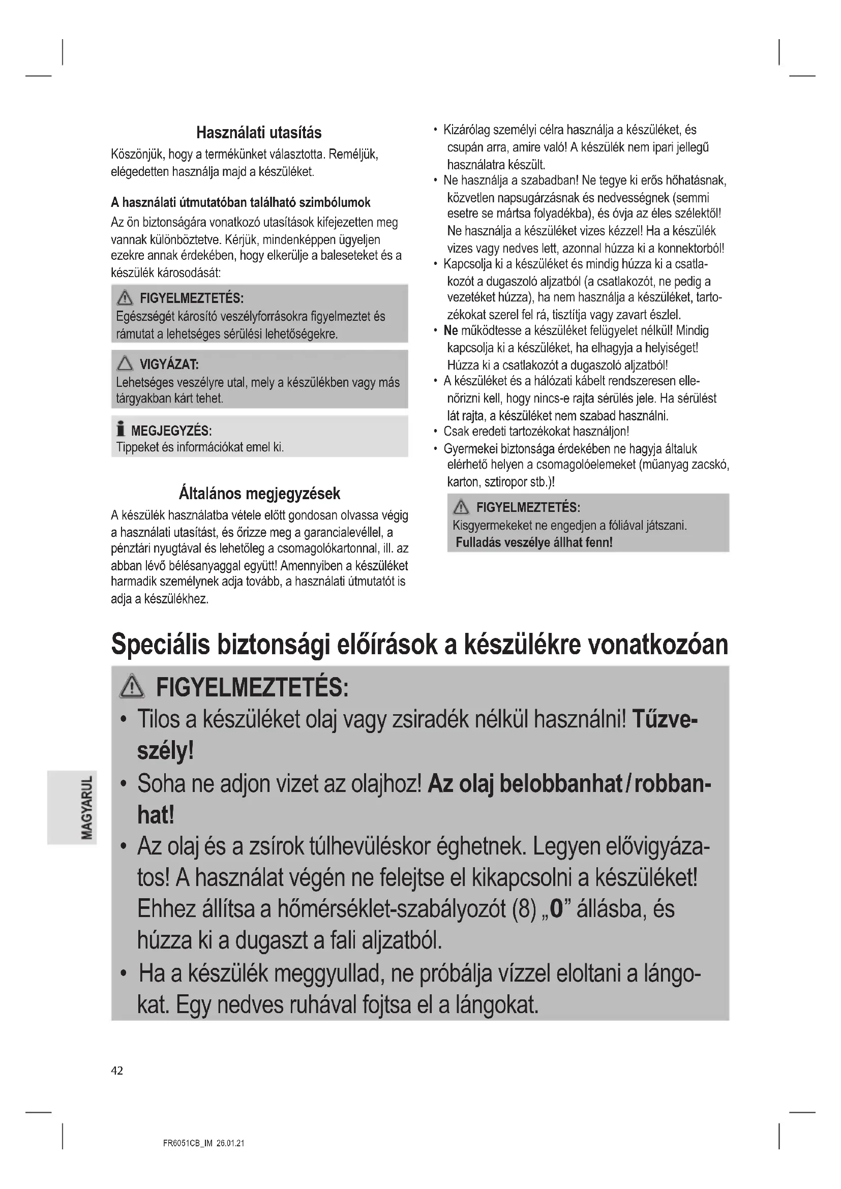 - Tilos a készüléket olaj vagy zsiradék nélkül használni! Tűzve- szély!