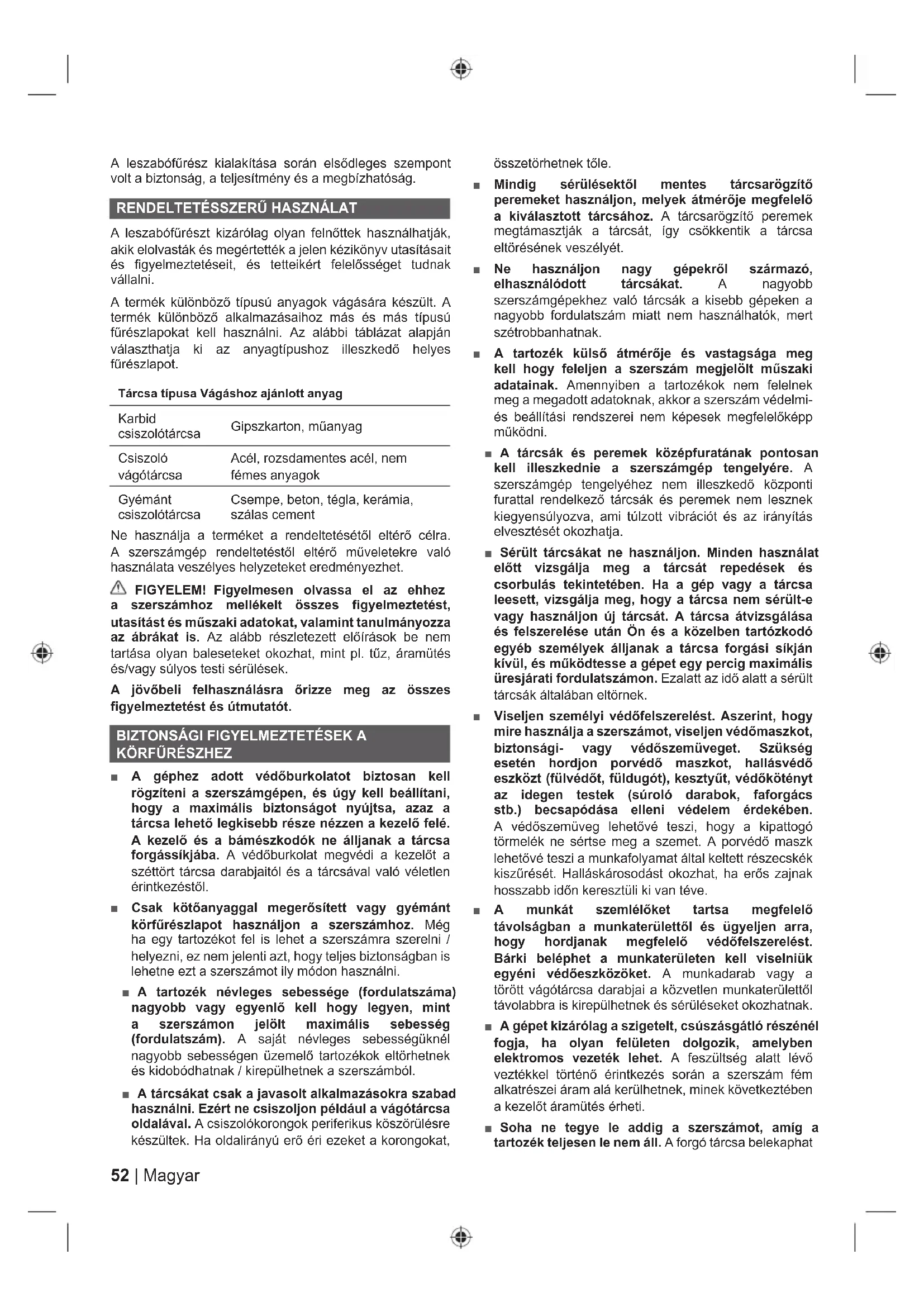 A leszabófűrészt kizárólag olyan felnőttek használhatják, akik elolvasták és megértették a jelen kézikönyv utasításait és fi gyelmeztetéseit, és tetteikért felelősséget tudnak vállalni. A termék különböző típusú anyagok vágására készült. A termék különböző alkalmazásaihoz más és más típusú fűrészlapokat kell használni. Az alábbi táblázat alapján választhatja ki az anyagtípushoz illeszkedő helyes fűrészlapot. Tárcsa típusa Vágáshoz ajánlott anyag Karbid csiszolótárcsa Gipszkarton, műanyag Csiszoló vágótárcsa Acél, rozsdamentes acél, nem fémes anyagok Gyémánt csiszolótárcsa Csempe, beton, tégla, kerámia, szálas cement Ne használja a terméket a rendeltetésétől eltérő célra. A szerszámgép rendeltetéstől eltérő műveletekre való használata veszélyes helyzeteket eredményezhet. FIGYELEM! Figyelmesen olvassa el az ehhez a szerszámhoz mellékelt összes figyelmeztetést, utasítást és műszaki adatokat, valamint tanulmányozza az ábrákat is. Az alább részletezett előírások be nem tartása olyan baleseteket okozhat, mint pl. tűz, áramütés és/vagy súlyos testi sérülések. A jövőbeli felhasználásra őrizze meg az összes figyelmeztetést és útmutatót.
