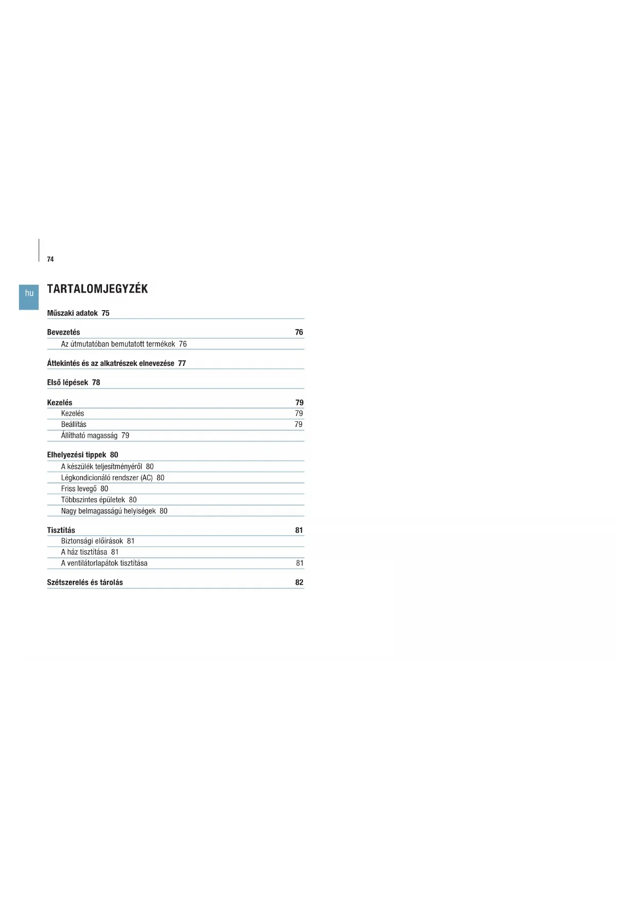 TARTALOMJEGYZÉK Műszaki adatok 75 Bevezetés 76 Az útmutatóban bemutatott termékek 76 Áttekintés és az alkatrészek elnevezése 77 Első lépések 78 Kezelés 79 Kezelés 79 Beállítás 79 Állítható magasság 79 Elhelyezési tippek 80 A készülék teljesítményéről 80 Légkondicionáló rendszer (AC) 80 Friss levegő 80 Többszintes épületek 80 Nagy belmagasságú helyiségek 80 Tisztítás 81 Biztonsági előírások 81 A ház tisztítása 81 A ventilátorlapátok tisztítása 81 Szétszerelés és tárolás 8275