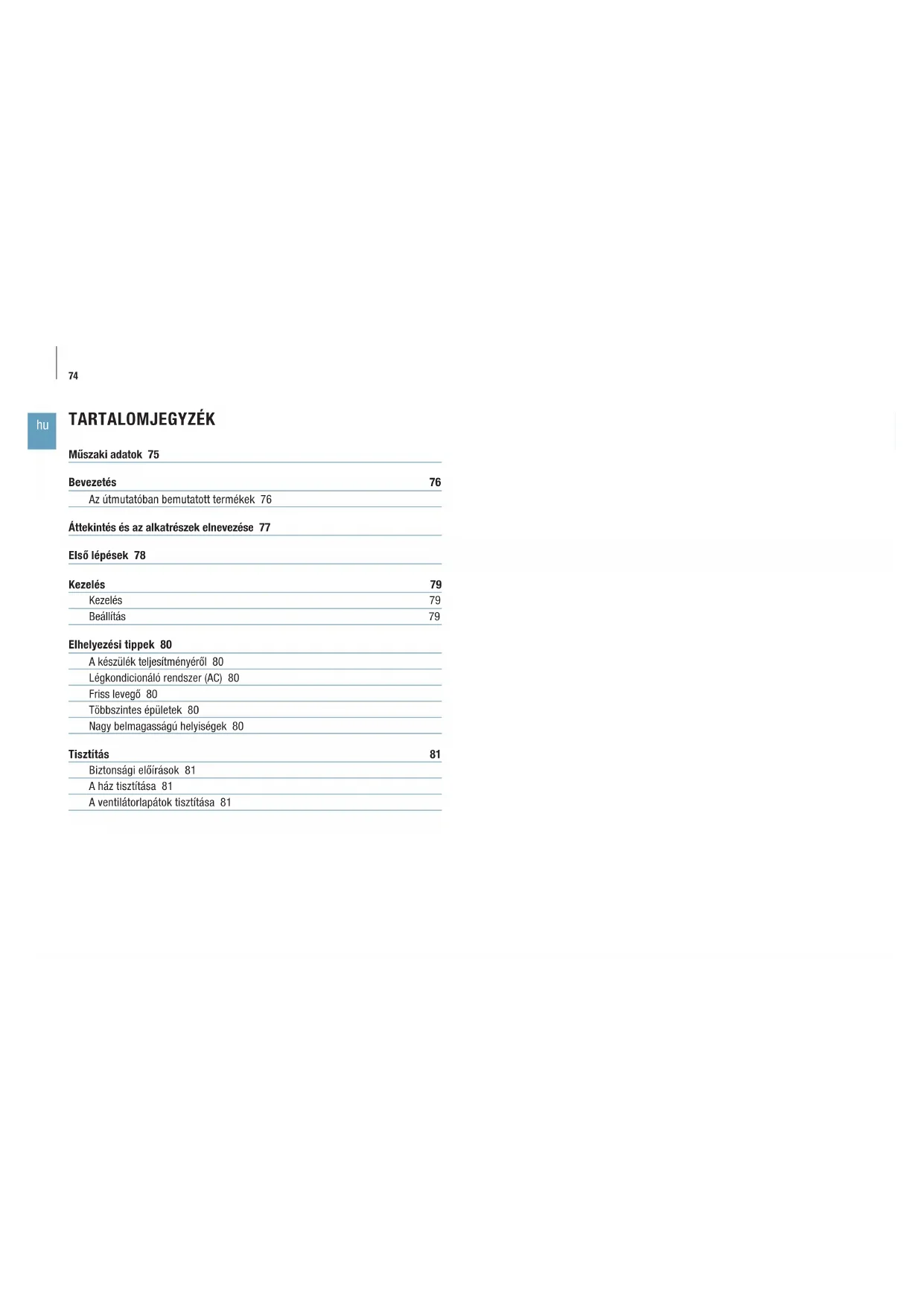 TARTALOMJEGYZÉK Műszaki adatok 75 Bevezetés 76 Az útmutatóban bemutatott termékek 76 Áttekintés és az alkatrészek elnevezése 77 Első lépések 78 Kezelés 79 Kezelés 79 Beállítás 79 Elhelyezési tippek 80 A készülék teljesítményéről 80 Légkondicionáló rendszer (AC) 80 Friss levegő 80 Többszintes épületek 80 Nagy belmagasságú helyiségek 80 Tisztítás 81 Biztonsági előírások 81 A ház tisztítása 81 A ventilátorlapátok tisztítása 8175