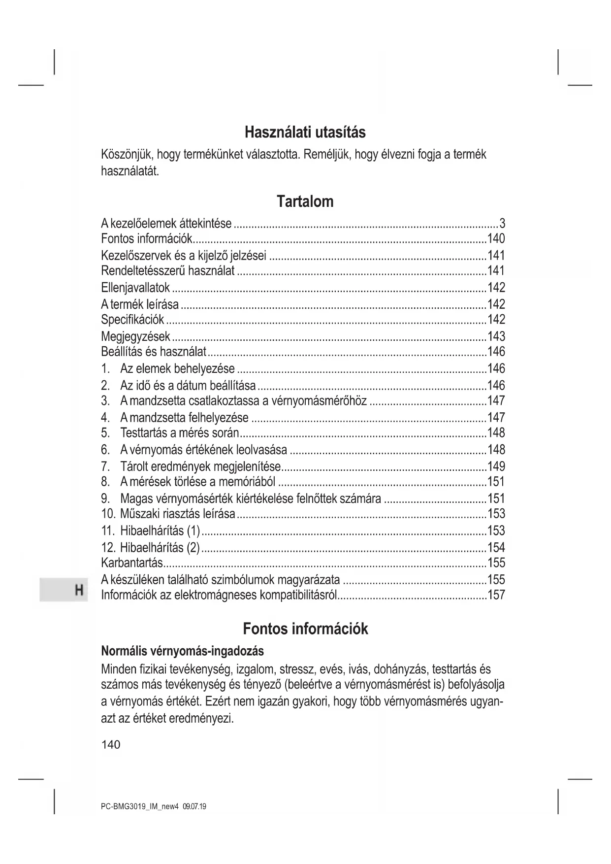 - Információk az elektromágneses kompatibilitásról Fontos információk Normális vérnyomás-ingadozás Minden zikai tevékenység, izgalom, stressz, evés, ivás, dohányzás, testtartás és számos más tevékenység és tényező (beleértve a vérnyomásmérést is) befolyásolja a vérnyomás értékét. Ezért nem igazán gyakori, hogy több vérnyomásmérés ugyan- azt az értéket eredményezi.PC-BMG3019_IM_new4 09.07.19 p. 157
