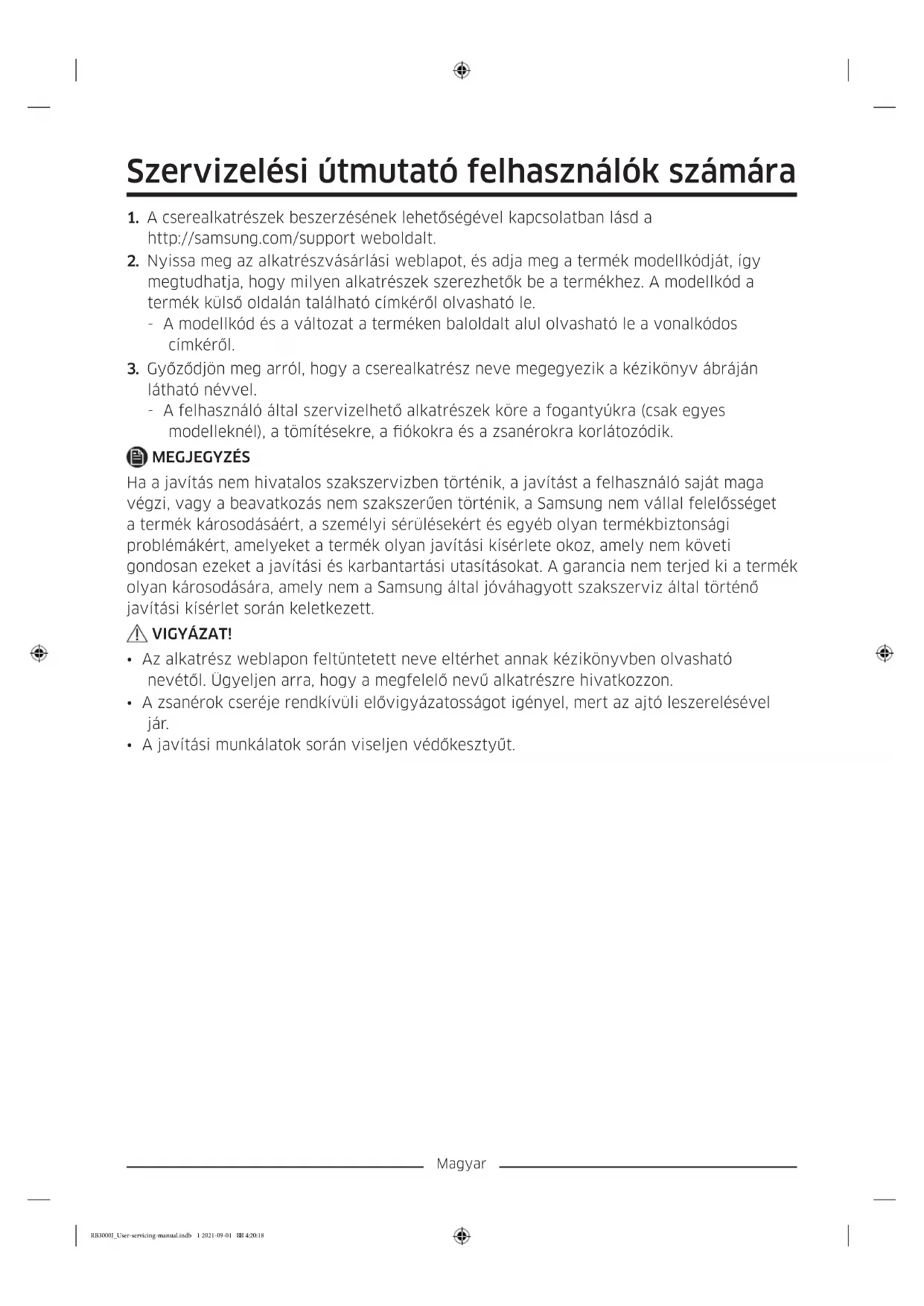 látható névvel. - A felhasználó által szervizelhető alkatrészek köre a fogantyúkra (csak egyes modelleknél), a tömítésekre, a ókokra és a zsanérokra korlátozódik. MEGJEGYZÉS Ha a javítás nem hivatalos szakszervizben történik, a javítást a felhasználó saját maga végzi, vagy a beavatkozás nem szakszerűen történik, a Samsung nem vállal felelősséget a termék károsodásáért, a személyi sérülésekért és egyéb olyan termékbiztonsági problémákért, amelyeket a termék olyan javítási kísérlete okoz, amely nem követi gondosan ezeket a javítási és karbantartási utasításokat. A garancia nem terjed ki a termék olyan károsodására, amely nem a Samsung által jóváhagyott szakszerviz által történő javítási kísérlet során keletkezett. VIGYÁZAT!
