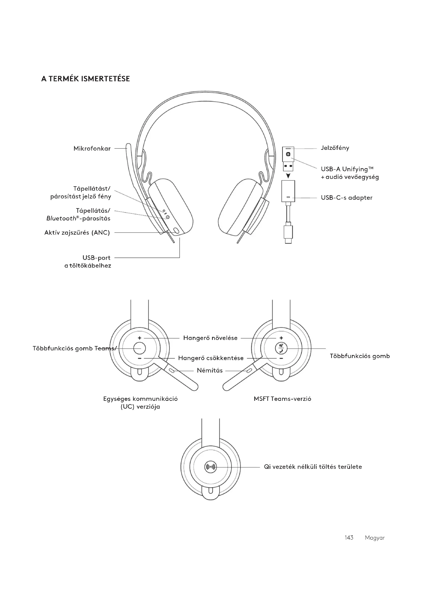 -párosítás USB-port atöltőkábelhez USB-C-s adapter Jelzőfény USB-A Unifying™ +audió vevőegység Hangerő növelése Hangerő csökkentése Némítás Többfunkciós gomb Teams/ Többfunkciós gomb Qi vezeték nélküli töltés területe Egységes kommunikáció (UC) verziója MSFT Teams-verzió 143 MagyarUSB-A USB-C ADAPTER USB-A | USB-CZone Wireless 2 mp