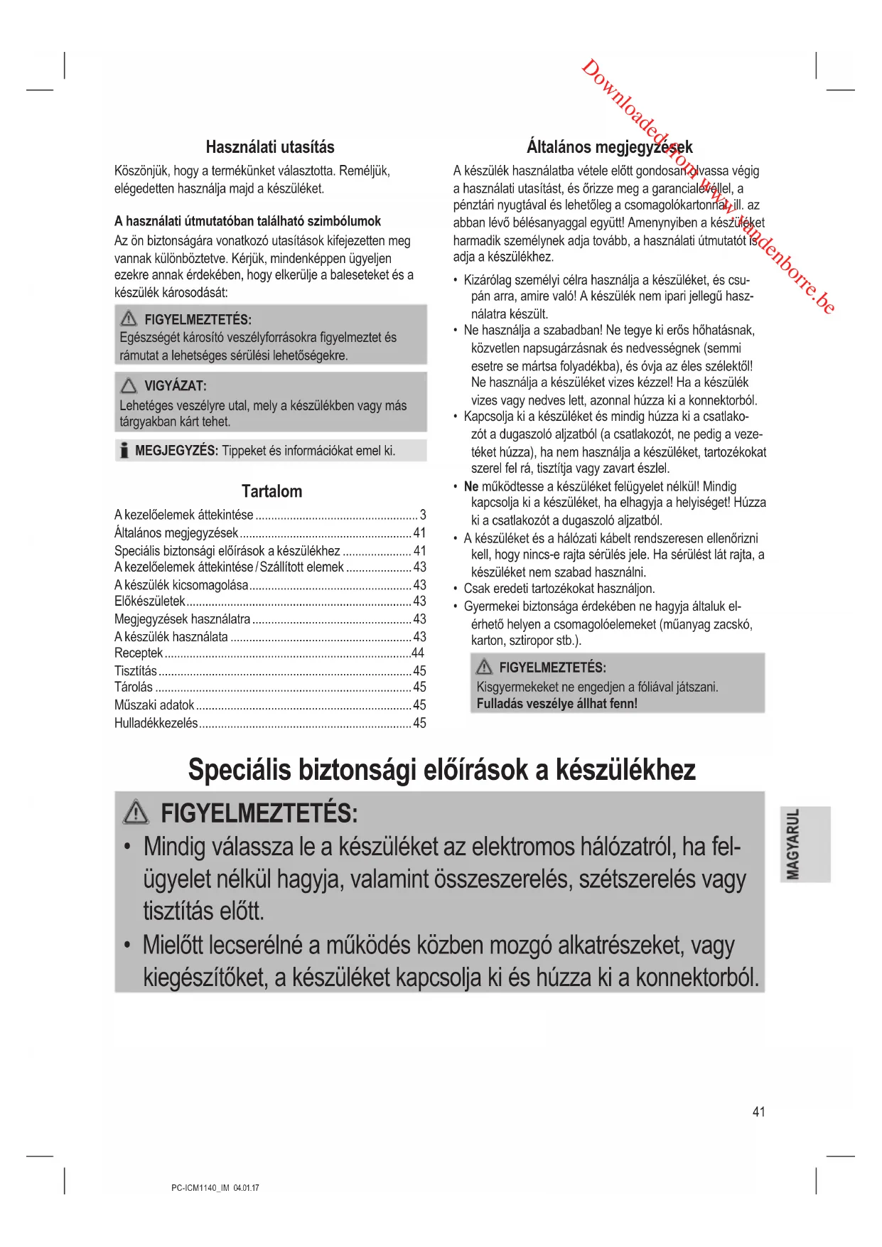 - Mielőtt lecserélné a működés közben mozgó alkatrészeket, vagy kiegészítőket, a készüléket kapcsolja ki és húzza ki a konnektorból. Downloaded from www.vandenborre.be42 PC-ICM1140_IM 04.01.17 FIGYELMEZTETÉS: