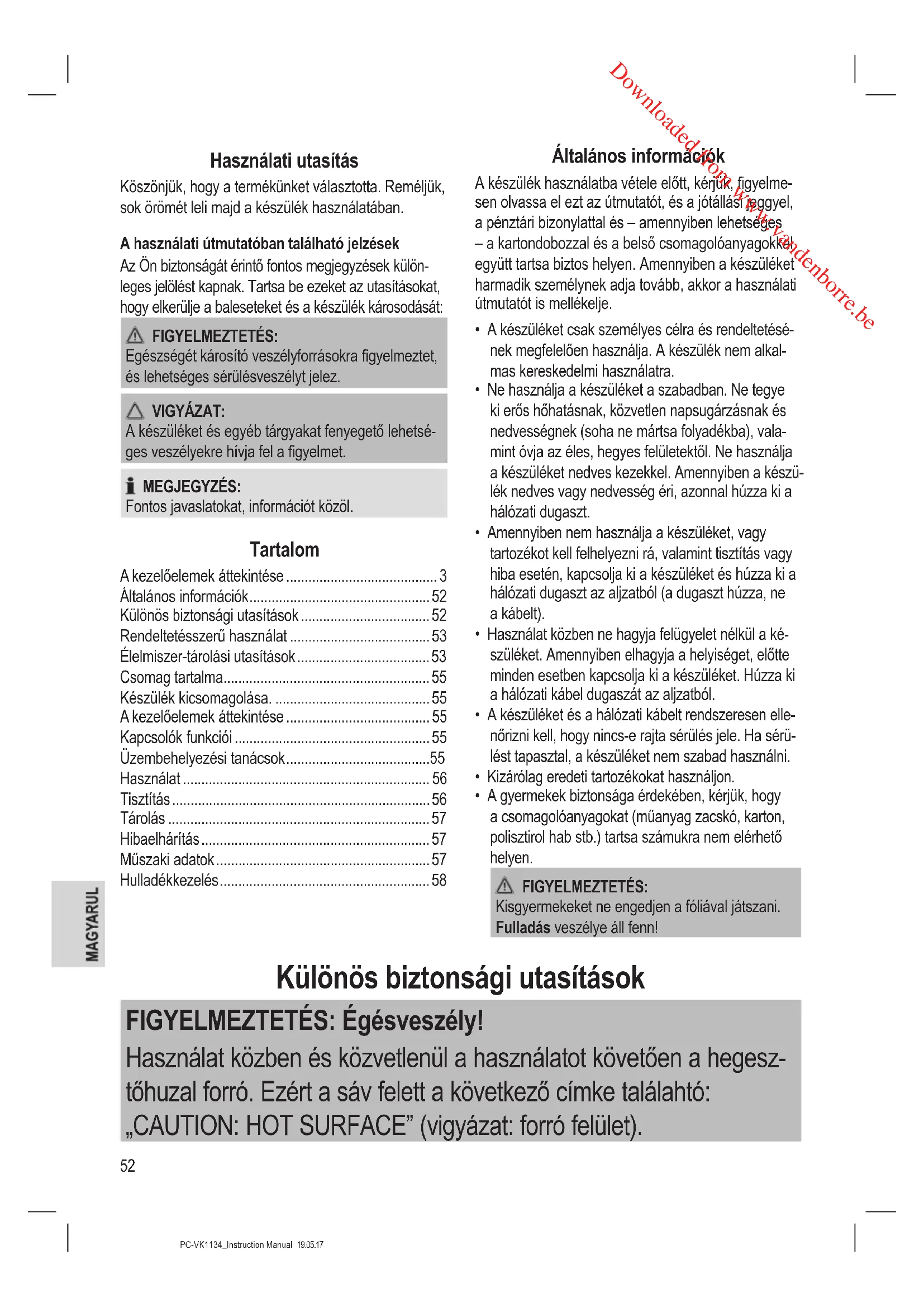 - Tisztítás előtt mindig húzzuk ki a hálózati dugaszt. Várja meg, amíg a készülék lehűlt. Downloaded from www.vandenborre.be57 PC-VK1134_Instruction Manual 19.05.17 VIGYÁZAT: