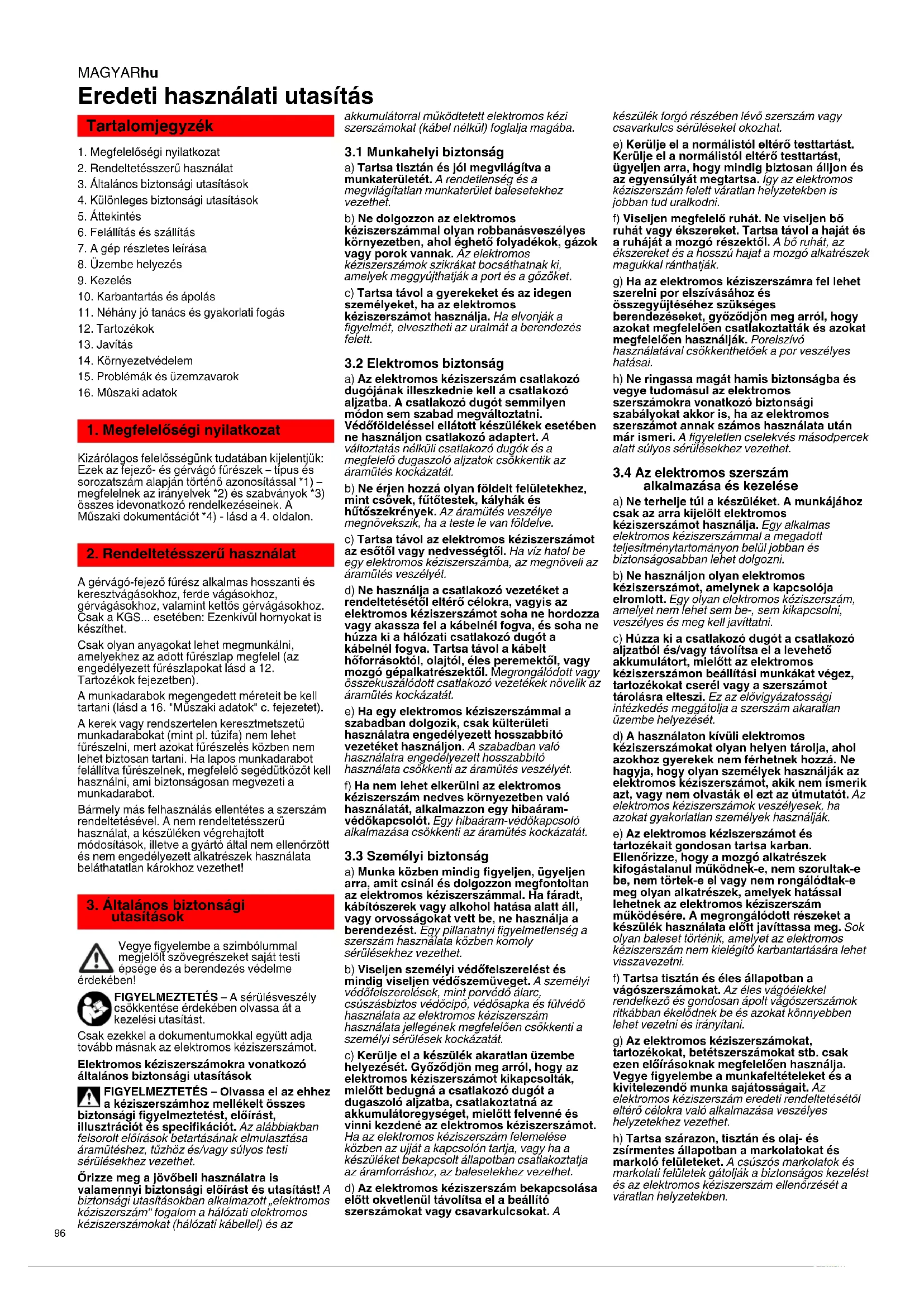 Kizárólagos felelősségünk tudatában kijelentjük: Ezek az fejező- és gérvágó fűrészek – típus és sorozatszám alapján történő azonosítással *1) – megfelelnek az irányelvek *2) és szabványok *3) összes idevonatkozó rendelkezéseinek. A Műszaki dokumentációt *4) - lásd a 4. oldalon. A gérvágó-fejező fűrész alkalmas hosszanti és keresztvágásokhoz, ferde vágásokhoz, gérvágásokhoz, valamint kettős gérvágásokhoz. Csak a KGS... esetében: Ezenkívül hornyokat is készíthet. Csak olyan anyagokat lehet megmunkálni, amelyekhez az adott fűrészlap megfelel (az engedélyezett fűrészlapokat lásd a 12. Tartozékok fejezetben). A munkadarabok megengedett méreteit be kell tartani (lásd a 16. "Műszaki adatok" c. fejezetet). A kerek vagy rendszertelen keresztmetszetű munkadarabokat (mint pl. tűzifa) nem lehet fűrészelni, mert azokat fűrészelés közben nem lehet biztosan tartani. Ha lapos munkadarabot felállítva fűrészelnek, megfelelő segédütközőt kell használni, ami biztonságosan megvezeti a munkadarabot. Bármely más felhasználás ellentétes a szerszám rendeltetésével. A nem rendeltetésszerű használat, a készüléken végrehajtott módosítások, illetve a gyártó által nem ellenőrzött és nem engedélyezett alkatrészek használata beláthatatlan károkhoz vezethet! Vegye figyelembe a szimbólummal megjelölt szövegrészeket saját testi épsége és a berendezés védelme érdekében! FIGYELMEZTETÉS – A sérülésveszély csökkentése érdekében olvassa át a kezelési utasítást. Csak ezekkel a dokumentumokkal együtt adja tovább másnak az elektromos kéziszerszámot. Elektromos kéziszerszámokra vonatkozó általános biztonsági utasítások FIGYELMEZTETÉS – Olvassa el az ehhez a kéziszerszámhoz mellékelt összes biztonsági figyelmeztetést, előírást, illusztrációt és specifikációt. Az alábbiakban felsorolt előírások betartásának elmulasztása áramütéshez, tűzhöz és/vagy súlyos testi sérülésekhez vezethet. Őrizze meg a jövőbeli használatra is valamennyi biztonsági előírást és utasítást! A biztonsági utasításokban alkalmazott „elektromos kéziszerszám“ fogalom a hálózati elektromos kéziszerszámokat (hálózati kábellel) és az akkumulátorral működtetett elektromos kézi szerszámokat (kábel nélkül) foglalja magába.