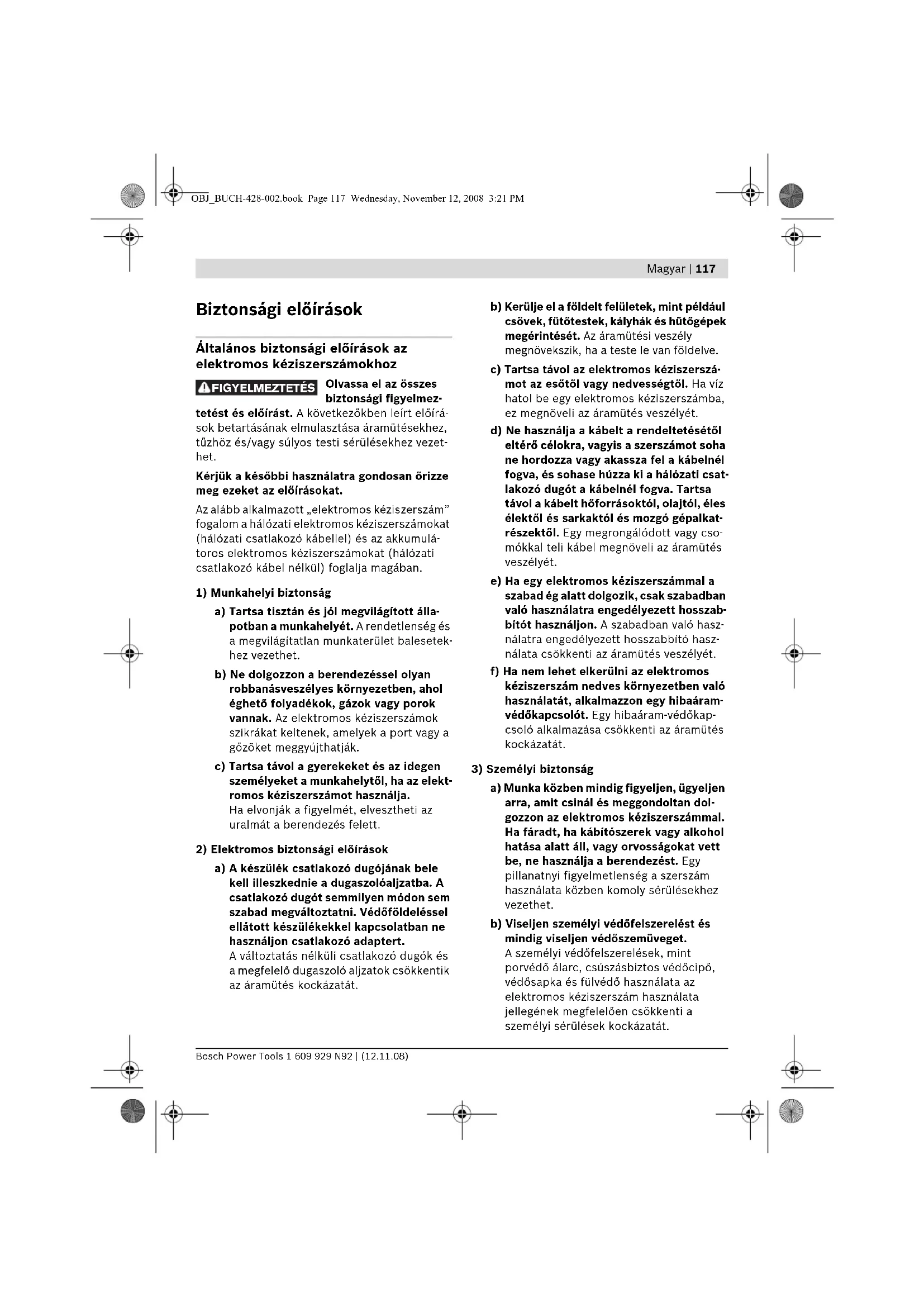 a) Munka közben mindig figyeljen, ügyeljen arra, amit csinál és meggondoltan dol- gozzon az elektromos kéziszerszámmal. Ha fáradt, ha kábítószerek vagy alkohol hatása alatt áll, vagy orvosságokat vett be, ne használja a berendezést. Egy pillanatnyi figyelmetlenség a szerszám használata közben komoly sérülésekhez vezethet. b) Viseljen személyi védőfelszerelést és mindig viseljen védőszemüveget. A személyi védőfelszerelések, mint porvédő álarc, csúszásbiztos védőcipő, védősapka és fülvédő használata az elektromos kéziszerszám használata jellegének megfelelően csökkenti a személyi sérülések kockázatát. FIGYELMEZTETÉS OBJ_BUCH-428-002.book Page 117 Wednesday, November 12, 2008 3:21 PM118 | Magyar 1 609 929 N92 | (12.11.08) Bosch Power Tools c) Kerülje el a készülék akaratlan üzembe helyezését. Győződjön meg arról, hogy az elektromos kéziszerszám ki van kap- csolva, mielőtt bedugná a csatlakozó dugót a dugaszolóaljzatba, csatlakoztat- ná az akkumulátor-csomagot, és mielőtt felvenné és vinni kezdené az elektromos kéziszerszámot. Ha az elektromos kézi- szerszám felemelése közben az ujját a kapcsolón tartja, vagy ha a készüléket bekapcsolt állapotban csatlakoztatja az áramforráshoz, ez balesetekhez vezethet. d) Az elektromos kéziszerszám bekap- csolása előtt okvetlenül távolítsa el a beállítószerszámokat vagy csavarkul- csokat. Az elektromos kéziszerszám forgó részeiben felejtett beállítószerszám vagy csavarkulcs sérüléseket okozhat. e) Ne becsülje túl önmagát. Kerülje el a normálistól eltérő testtartást, ügyeljen arra, hogy mindig biztosan álljon és az egyensúlyát megtartsa. Így az elektromos kéziszerszám felett váratlan helyzetekben is jobban tud uralkodni. f) Viseljen megfelelő ruhát. Ne viseljen bő ruhát vagy ékszereket. Tartsa távol a haját, a ruháját és a kesztyűjét a mozgó részektől. A bő ruhát, az ékszereket és a hosszú hajat a mozgó alkatrészek magukkal ránthatják. g) Ha az elektromos kéziszerszámra fel lehet szerelni a por elszívásához és ös- szegyűjtéséhez szükséges berendezé- seket, ellenőrizze, hogy azok megfelelő módon hozzá vannak kapcsolva a készülékhez és rendeltetésüknek meg- felelően működnek. A porgyűjtő beren- dezések használata csökkenti a munka során keletkező por veszélyes hatását.