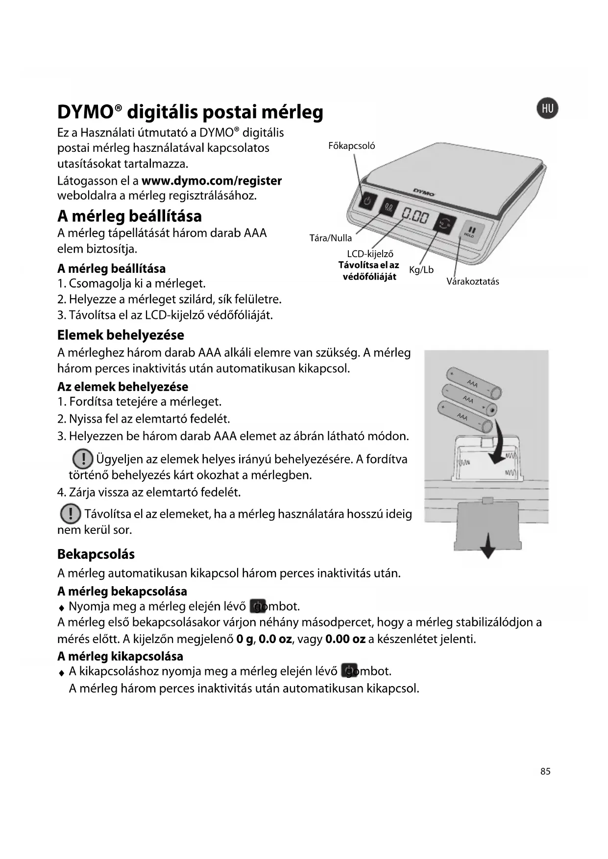 DYMO® digitális postai mérleg Ez a Használati útmutató a DYMO® digitális postai mérleg használatával kapcsolatos utasításokat tartalmazza. Látogasson el a www.dymo.com/register weboldalra a mérleg regisztrálásához. A mérleg beállítása A mérleg tápellátását három darab AAA elem biztosítja. A mérleg beállítása