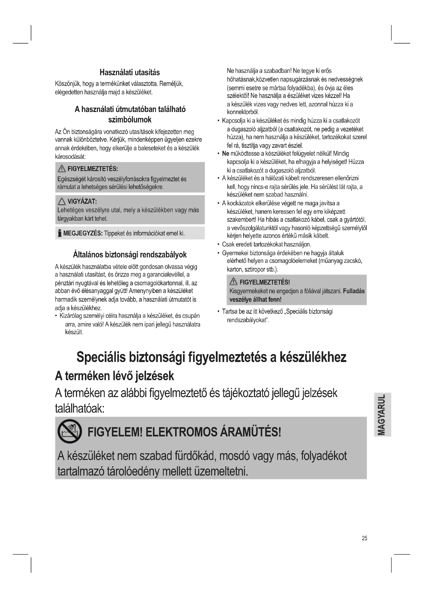 - Kizárólag személyi célra használja a készüléket, és csupán arra, amire való! A készülék nem ipari jellegű használatra készült. Speciális biztonsági gyelmeztetés a készülékhez A terméken lévő jelzések A terméken az alábbi gyelmeztető és tájékoztató jellegű jelzések találhatóak: FIGYELEM! ELEKTROMOS ÁRAMÜTÉS! A készüléket nem szabad fürdőkád, mosdó vagy más, folyadékot tartalmazó tárolóedény mellett üzemeltetni.26 FIGYELMEZTETÉS: