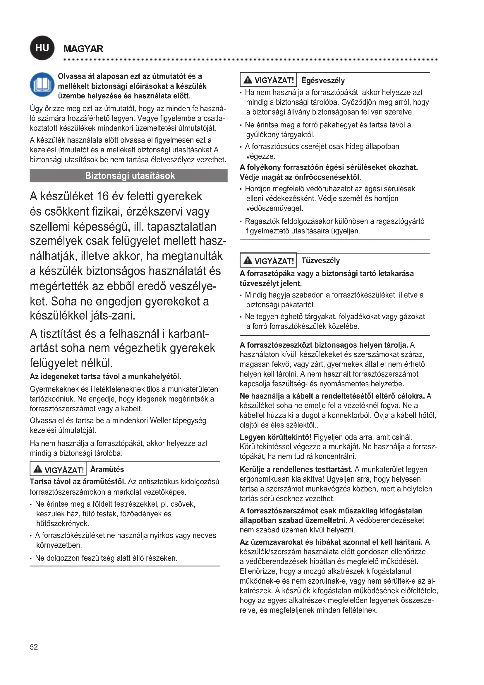 artást soha nem végezhetik gyerekek felügyelet nélkül. Az idegeneket tartsa távol a munkahelyétől. Gyermekeknek és illetékteleneknek tilos a munkaterületen tartózkodniuk. Ne engedje, hogy idegenek megérintsék a forrasztószerszámot vagy a kábelt. Olvassa el és tartsa be a mindenkori Weller tápegység kezelési útmutatóját. Ha nem használja a forrasztópákát, akkor helyezze azt mindig a biztonsági tárolóba. VIGYÁZAT! Áramütés Tartsa távol az áramütéstől. Az antisztatikus kidolgozású forrasztószerszámokon a markolat vezetőképes.