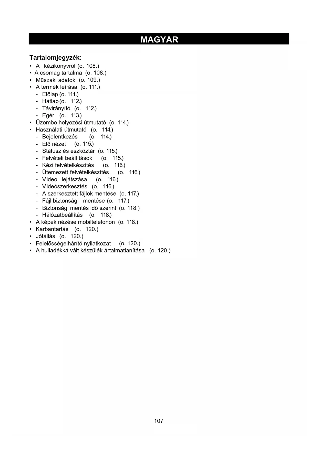 - Használati útmutató (o. 114.) - Bejelentkezés (o. 114.) - Élő nézet (o. 115.)