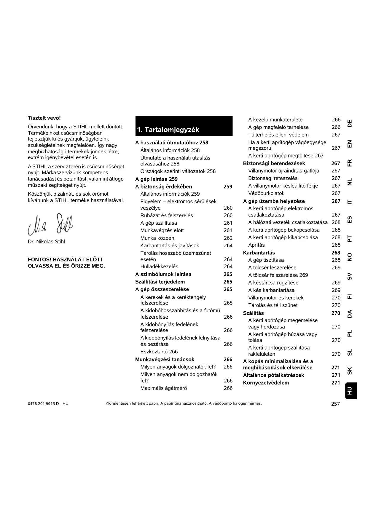 DEENFRNLITESPTNOSVFIDAPLSLSKHU 0478 201 9915 D - HU Tisztelt vevő! Örvendünk, hogy a STIHL mellett döntött. Termékeinket csúcsminőségben fejlesztjük ki és gyártjuk, ügyfeleink szükségleteinek megfelelően. Így nagy megbízhatóságú termékek jönnek létre, extrém igénybevétel esetén is. A STIHL a szerviz terén is csúcsminőséget nyújt. Márkaszervizünk kompetens tanácsadást és betanítást, valamint átfogó műszaki segítséget nyújt. Köszönjük bizalmát, és sok örömöt kívánunk a STIHL terméke használatával. Dr. Nikolas Stihl