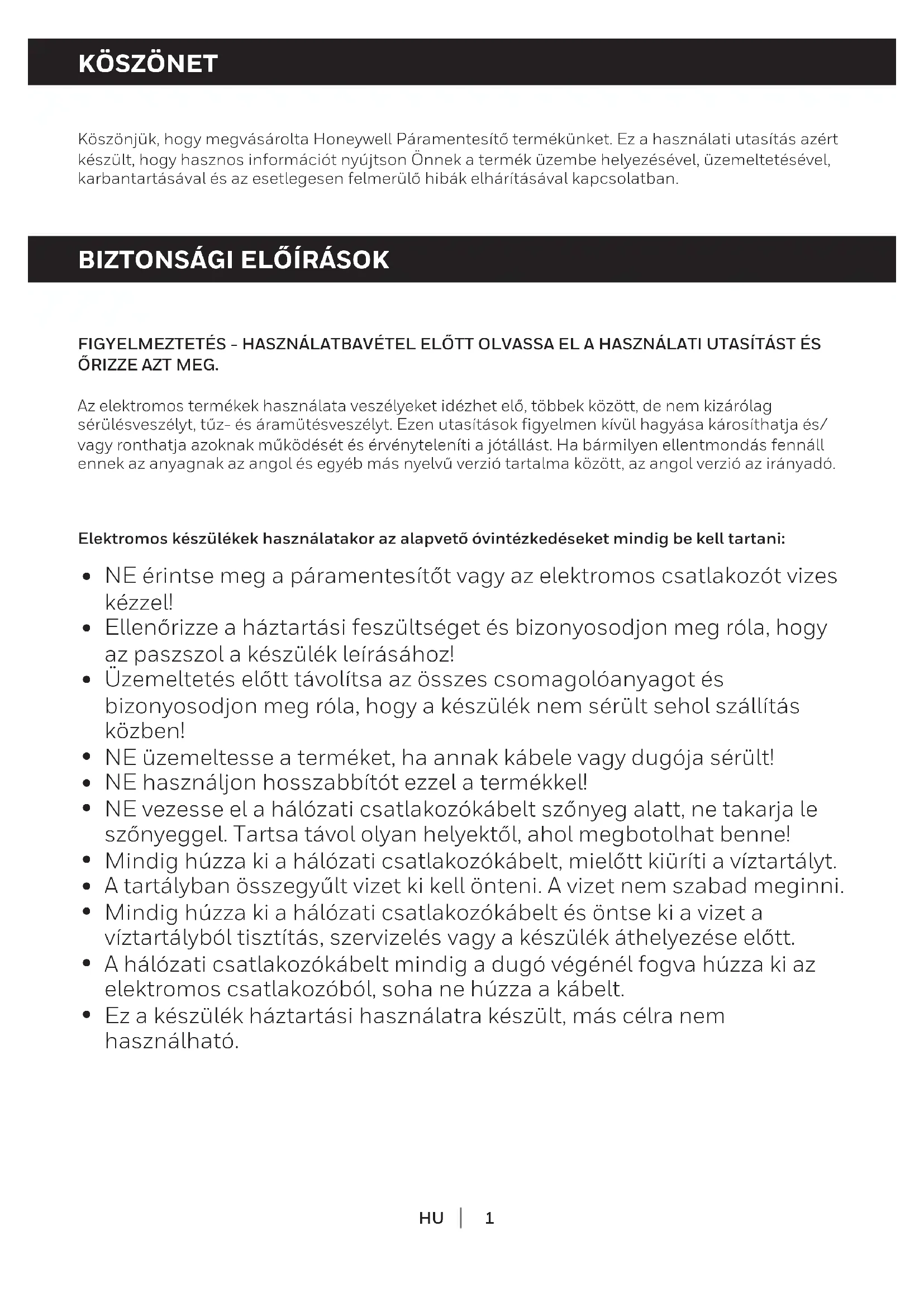 Köszönjük, hogy megvásárolta Honeywell Páramentesítő termékünket. Ez a használati utasítás azért készült, hogy hasznos információt nyújtson Önnek a termék üzembe helyezésével, üzemeltetésével, karbantartásával és az esetlegesen felmerülő hibák elhárításával kapcsolatban. FIGYELMEZTETÉS - HASZNÁLATBAVÉTEL ELŐTT OLVASSA EL A HASZNÁLATI UTASÍTÁST ÉS ŐRIZZE AZT MEG. Az elektromos termékek használata veszélyeket idézhet elő, többek között, de nem kizárólag sérülésveszélyt, tűz- és áramütésveszélyt. Ezen utasítások figyelmen kívül hagyása károsíthatja és/ vagy ronthatja azoknak működését és érvényteleníti a jótállást. Ha bármilyen ellentmondás fennáll ennek az anyagnak az angol és egyéb más nyelvű verzió tartalma között, az angol verzió az irányadó. Elektromos készülékek használatakor az alapvető óvintézkedéseket mindig be kell tartani: