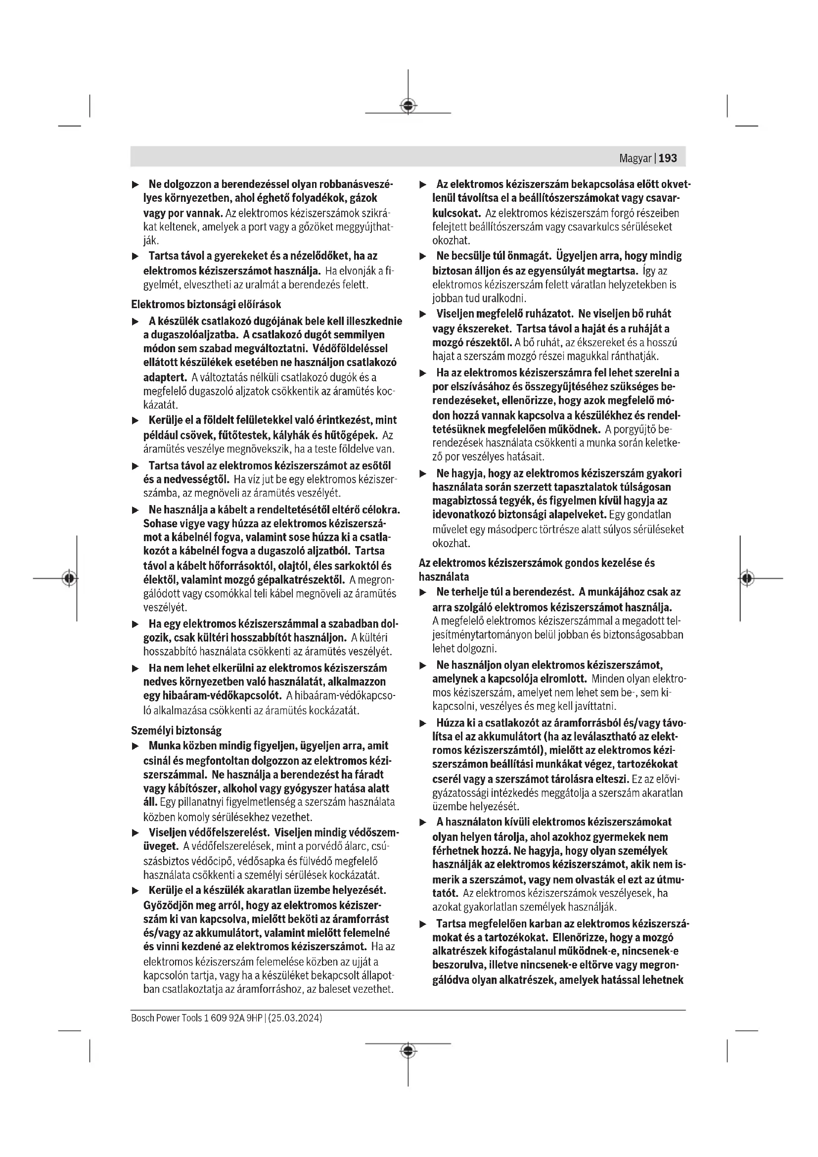 Vyhotovenie zapínača/vypínača saretáciou Bosch Power Tools 1 609 92A 9HP | (25.03.2024)192 | Magyar Na uvedenie elektrického náradia do prevádzky stlačte najprv zapínač/vypínač(2) ➊, potom ho posuňte dopredu ➋. Napokon ho stlačte adržte stlačený ➌. Na zaaretovanie stlačeného zapínača/vypínača(2) posuňte zapínač/vypínač(2) ďalej dopredu ➍. Na vypnutie elektrického náradia uvoľnite zapínač/ vypínač(2) alebo, ak je zaaretovaný, zapínač/vypínač(2) krátko stlačte apotom ho uvoľnite. Vyhotovenie zapínača/vypínača bez aretácie Na uvedenie elektrického náradia do prevádzky stlačte najprv zapínač/vypínač(2) ➊, potom ho posuňte dopredu ➋. Napokon ho stlačte adržte stlačený ➌. Na vypnutie elektrického náradia uvoľnite zapínač/ vypínač(2). u Brúsne nástroje pred použitím skontrolujte. Brúsny nástroj musí byť bezchybne namontovaný amusí sa dať voľne otáčať. Vykonajte skúšobný chod aspoň po- čas 1 minúty bez zaťaženia. Nepoužívajte žiadne po- škodené, zdeformované alebo vibrujúce brúsne ná- stroje. Poškodené brúsne nástroje môžu prasknúť aspô- sobiť zranenia. Údržba aservis Údržba ačistenie u Pred všetkými prácami na elektrickom náradí vytiah- nite sieťovú zástrčku zo zásuvky. u Elektrické náradie ajeho vetracie štrbiny udržiavajte vždy včistote, aby ste mohli pracovať dobre abezpeč- ne. u Pri extrémnych podmienkach používania vždy podľa možnosti použite odsávacie zariadenie. Vetracie štrbi- ny často vyfukujte apredraďte prúdový chránič (PRCD). Pri obrábaní kovov sa môže vo vnútri elektrické- ho náradia usádzať vodivý prach. To môže mať negatívny vplyv na ochrannú izoláciu elektrického náradia. Príslušenstvo skladujte aošetrujte starostlivo. Ak je potrebná výmena pripájacieho vedenia, musí ju vy- konať Bosch alebo niektoré autorizované stredisko služieb zákazníkom pre elektrické náradie Bosch, aby sa zabránilo ohrozeniam bezpečnosti. Zásobník na prach Zásobník na prach(3) odporúčame čistiť po použití denne alebo vpravidelných intervaloch, aby sa zaručila optimálna ochrana proti prachu. Intervaly čistenia závisia od použitia. Zákaznícka služba aporadenstvo ohľadom použitia Servisné stredisko Vám odpovie na otázky týkajúce sa opravy aúdržby Vášho produktu ako aj náhradných dielov. Rozkladové výkresy ainformácie onáhradných dieloch náj- dete tiež na: www.bosch-pt.com Vprípade otázok týkajúcich sa našich výrobkov apríslušen- stva Vám ochotne pomôže poradenský tím Bosch. Vprípade akýchkoľvek otázok aobjednávok náhradných dielov uvádzajte bezpodmienečne 10‑miestne vecné číslo uvedené na typovom štítku výrobku. Slovakia Na www.bosch-pt.sk si môžete objednať opravu vášho stroja alebo náhradné diely online. Tel.: +421 2 48 703 800 Fax: +421 2 48 703 801 E-Mail: servis.naradia@sk.bosch.com www.bosch-pt.sk Ďalšie adresy servisov nájdete na: www.bosch-pt.com/serviceaddresses Likvidácia Elektrické náradie, príslušenstvo aobaly treba odovzdať na ekologickú recykláciu. Nevyhadzujte elektrické náradie do bežného odpadu zdomácnosti! Len pre krajinyEÚ: Elektrické náradie, ktoré už nie je vhodné na používanie, sa musí likvidovať oddelene. Využívajte na to určené zberné systémy. Pri nesprávnej likvidácii môžu mať staré elektrické aelektro- nické zariadenia kvôli možnej prítomnosti nebezpečných látok škodlivý vplyv na životné prostredie aľudské zdravie. Magyar Biztonsági tájékoztató Általános biztonsági előírások az elektromos kéziszerszámok számára FIGYELMEZ- TETÉS Olvassa el valamennyi biztonsági tájékoztatót, előírást, illusztrációt és adatot, amelyet az elektromos kéziszerszámmal együtt megkapott. Az alábbiakban felso- rolt előírások betartásának elmulasztása áramütéshez, tűz- höz és/vagy súlyos testi sérülésekhez vezethet. Kérjük a későbbi használatra gondosan őrizze meg eze- ket az előírásokat. Az alább alkalmazott "elektromos kéziszerszám" fogalom a hálózati elektromos kéziszerszámokat (hálózati csatlakozó kábellel) és az akkumulátoros elektromos kéziszerszámokat (hálózati csatlakozó kábel nélkül) foglalja magában. Munkahelyi biztonság u Tartsa tisztán és jól megvilágítva a munkaterületet. A zsúfolt vagy sötét területeken gyakrabban következnek be balesetek. 1 609 92A 9HP | (25.03.2024) Bosch Power ToolsMagyar | 193 u Ne dolgozzon a berendezéssel olyan robbanásveszé- lyes környezetben, ahol éghető folyadékok, gázok vagy por vannak. Az elektromos kéziszerszámok szikrá- kat keltenek, amelyek a port vagy a gőzöket meggyújthat- ják. u Tartsa távol a gyerekeket és a nézelődőket, ha az elektromos kéziszerszámot használja. Haelvonják a fi- gyelmét, elvesztheti az uralmát a berendezés felett. Elektromos biztonsági előírások u A készülék csatlakozó dugójának bele kell illeszkednie a dugaszolóaljzatba. A csatlakozó dugót semmilyen módon sem szabad megváltoztatni. Védőföldeléssel ellátott készülékek esetében ne használjon csatlakozó adaptert. Aváltoztatás nélküli csatlakozó dugók és a megfelelő dugaszoló aljzatok csökkentik az áramütés koc- kázatát. u Kerülje el a földelt felületekkel való érintkezést, mint például csövek, fűtőtestek, kályhák és hűtőgépek. Az áramütés veszélye megnövekszik, ha a teste földelve van. u Tartsa távol az elektromos kéziszerszámot az esőtől és a nedvességtől. Ha víz jut be egy elektromos kéziszer- számba, az megnöveli az áramütés veszélyét. u Ne használja a kábelt a rendeltetésétől eltérő célokra. Sohase vigye vagy húzza az elektromos kéziszerszá- mot a kábelnél fogva, valamint sose húzza ki a csatla- kozót a kábelnél fogva a dugaszoló aljzatból. Tartsa távol a ká