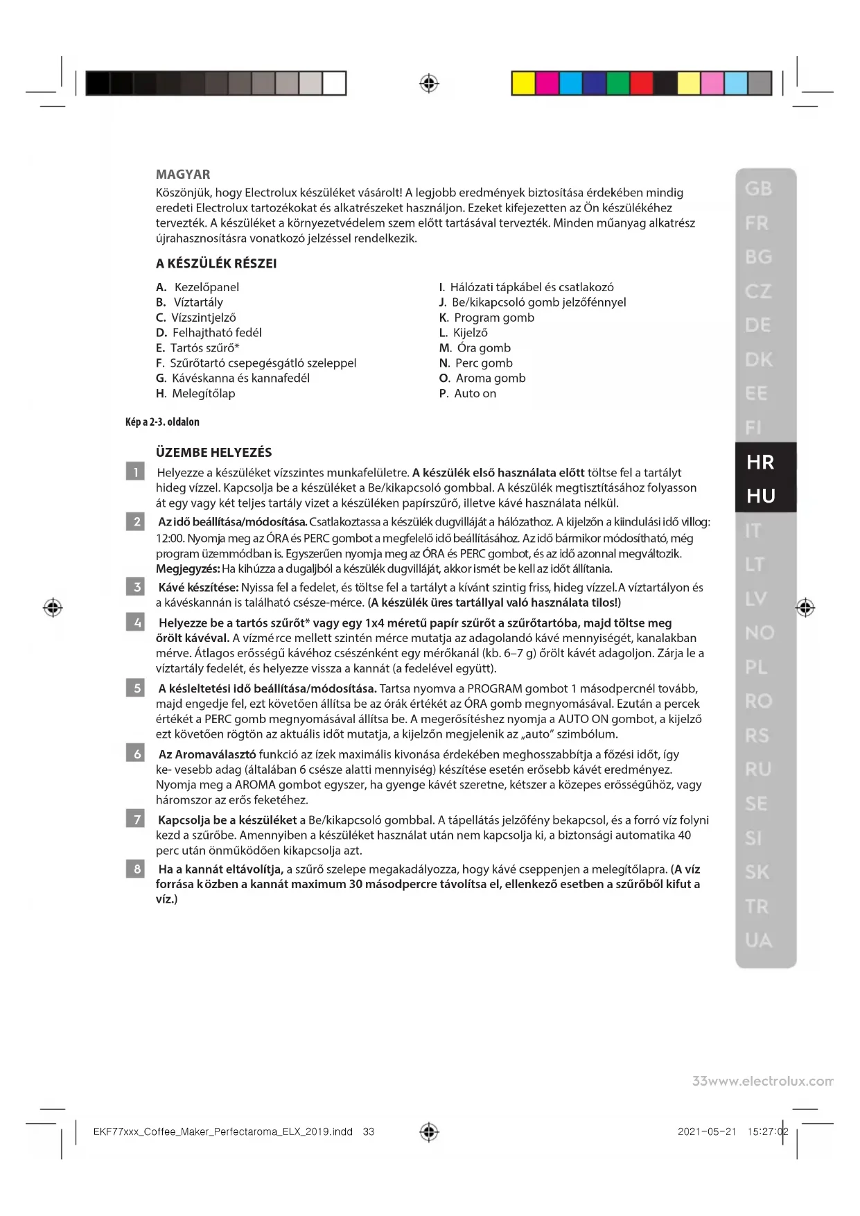 Ez a szimbólum azt jelzi, hogy a készülékben elem van, amelyet nem szabad a háztartási hulladékba dobni. Ez a szimbólum a terméken vagy a csomagoláson azt jelzi, hogy a készülék nem kezelhető háztartási hulladékként. A készülék újrahasznosításához vigye azt egy gyűjtőhelyre vagy egy Electrolux szervizközpontba, ahol az elemet és az elektromos alkatrészeket biztonságosan és professzionálisan tudják kiszerelni és újrahasznosítani. Az elektromos termékek és a tölthető akkumulátorok elkülönített gyűjtéséhez tartsa be országa szabályait. EKF77xxx_Coffee_Maker_Perfectaroma_ELX_2019.indd 35