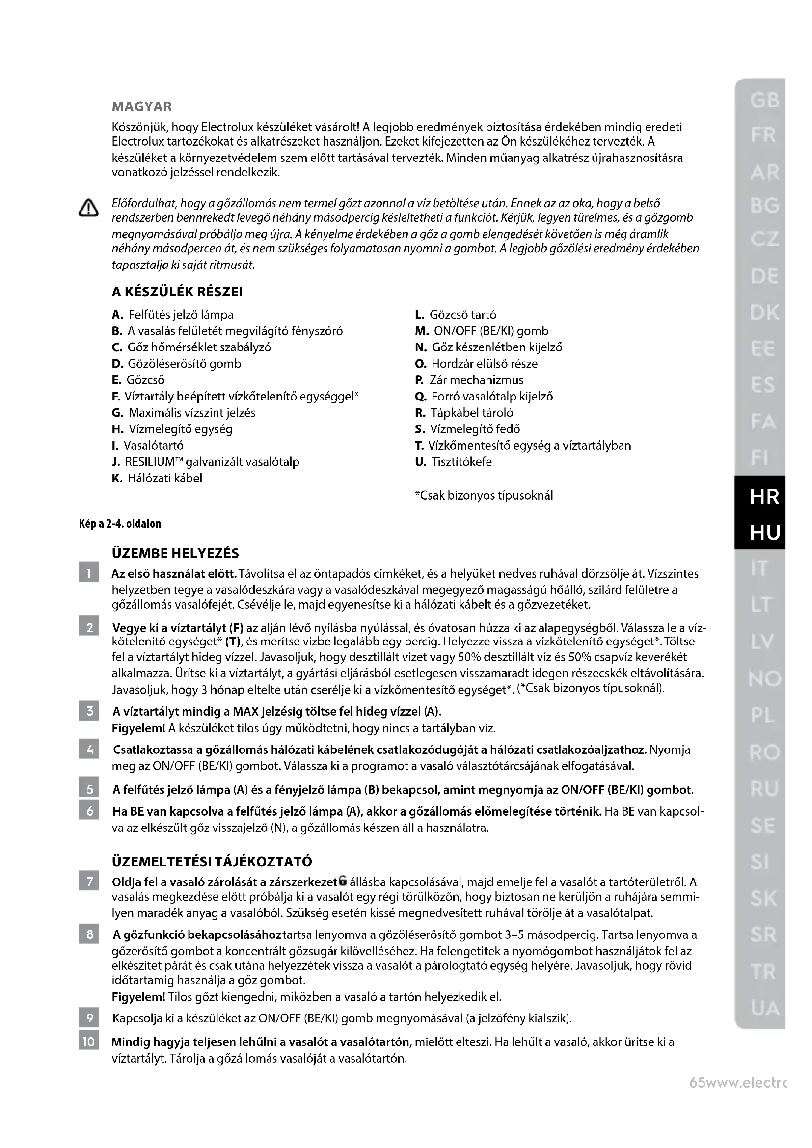 J. RESILIUM™ galvanizált vasalótalp K. Hálózati kábel L. Gőzcső tartó M. ON/OFF (BE/KI) gomb N. Gőz készenlétben kijelző O. Hordzár elülső része P. Zár mechanizmus Q. Forró vasalótalp kijelző R. Tápkábel tároló S. Vízmelegítő fedő T. Vízkőmentesítő egység a víztartályban U. Tisztítókefe *Csak bizonyos típusoknál Kép a 2-4. oldalon