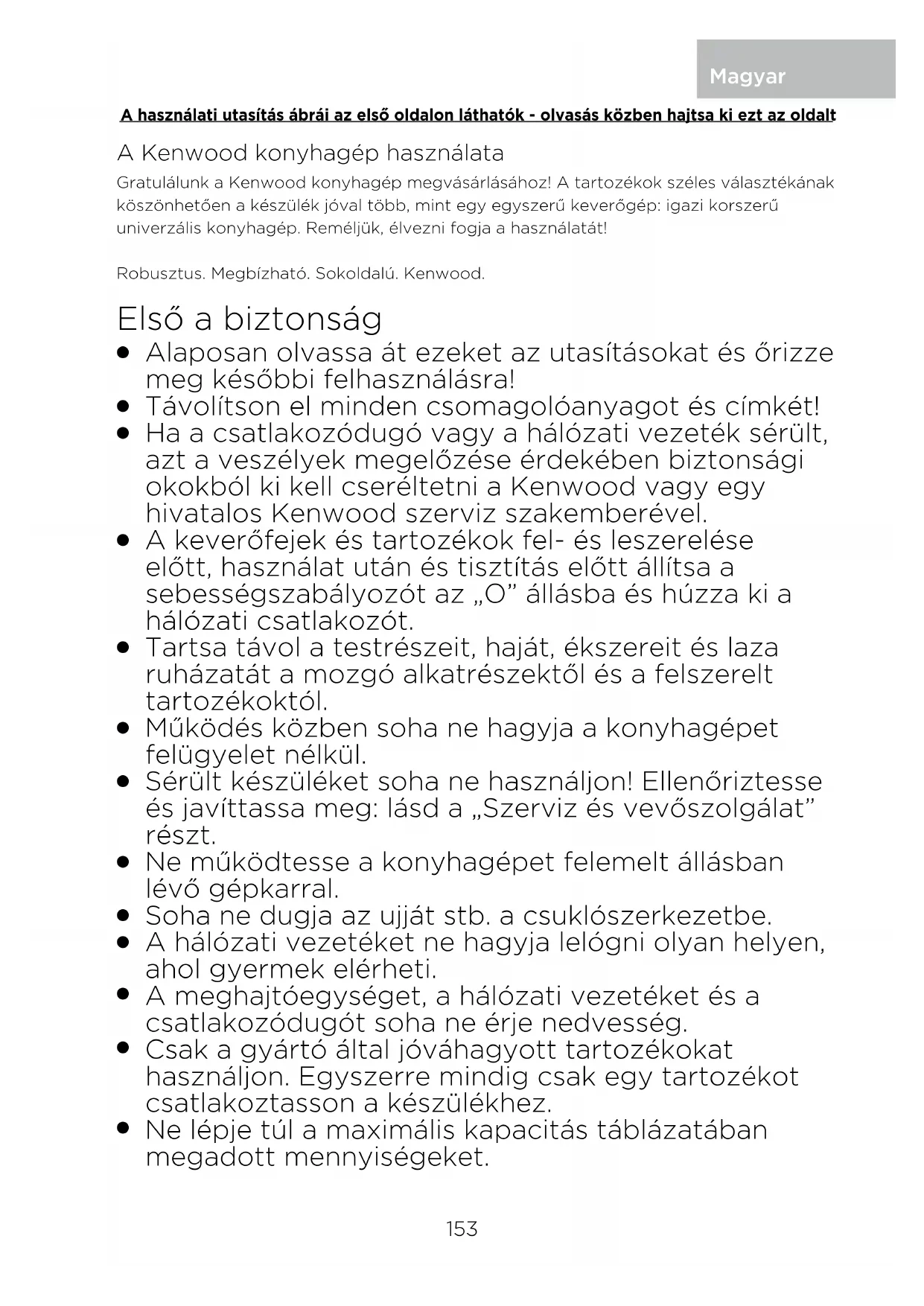 Ne lépje túl a maximális kapacitás táblázatában megadott mennyiségeket. Magyar A használati utasítás ábrái az első oldalon láthatók - olvasás közben hajtsa ki ezt az oldalt 153O Tartozék használatakor olvassa el és tartsa be a hozzá mellékelt biztonsági utasításokat.