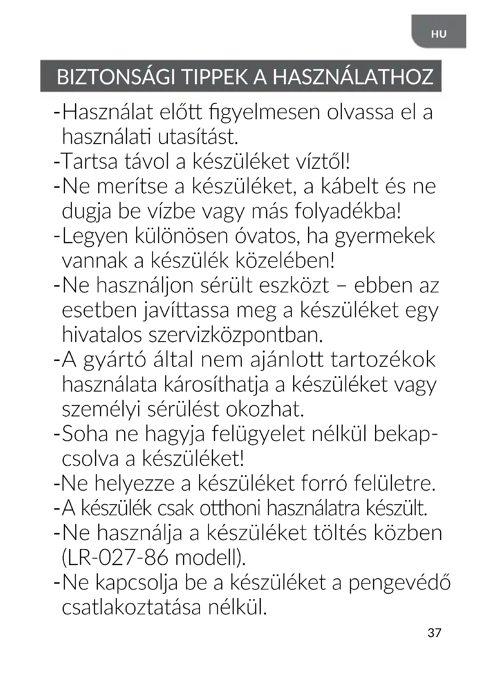 Ne használja a készüléket töltés közben (LR-027-86 modell).