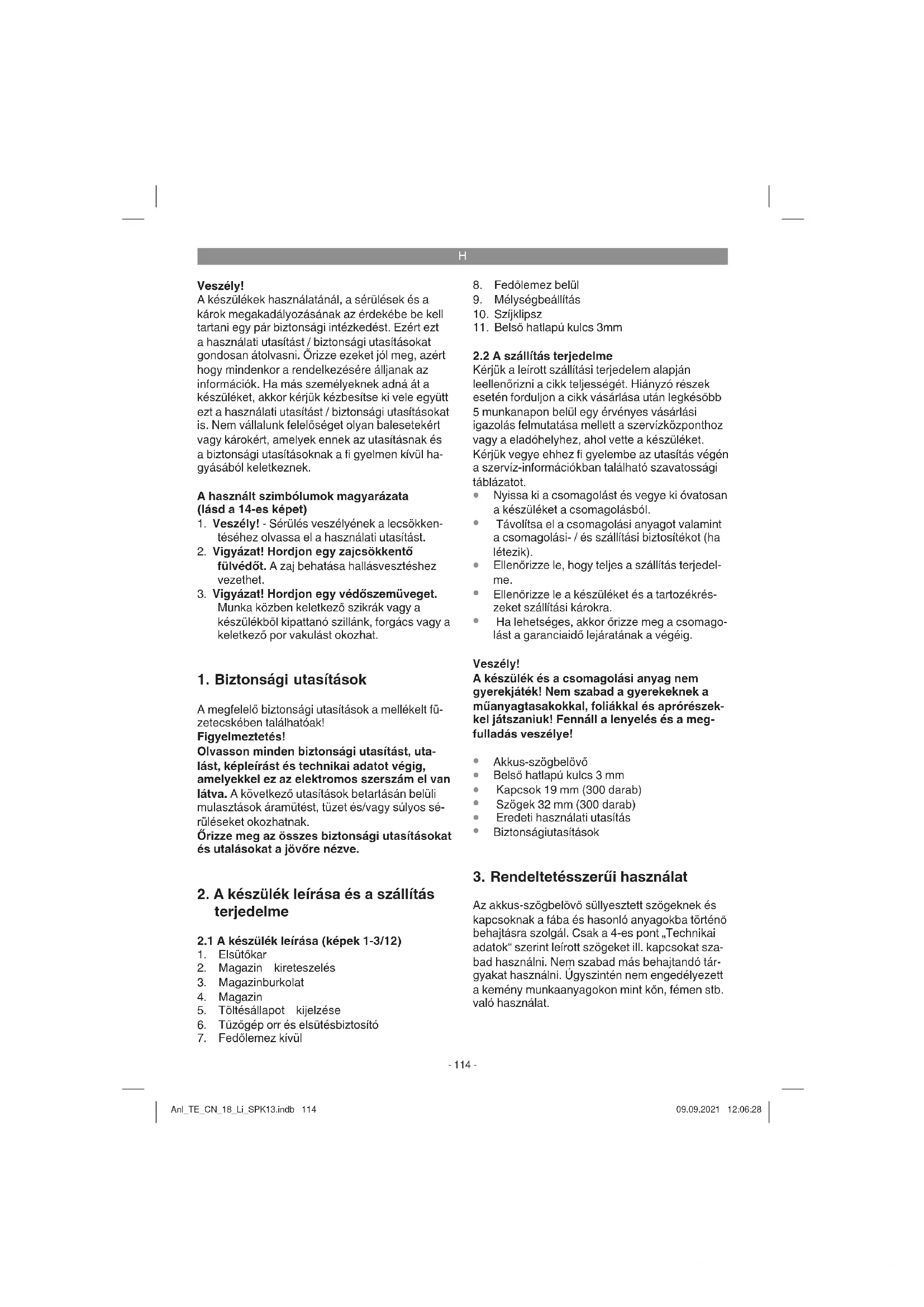 Az akkus-szögbelövő süllyesztett szögeknek és kapcsoknak a fába és hasonló anyagokba történő behajtásra szolgál. Csak a 4-es pont „Technikai adatok“ szerint leírott szögeket ill. kapcsokat sza- bad használni. Nem szabad más behajtandó tár- gyakat használni. Úgyszintén nem engedélyezett a kemény munkaanyagokon mint kőn, fémen stb. való használat. Anl_TE_CN_18_Li_SPK13.indb 114Anl_TE_CN_18_Li_SPK13.indb 114 09.09.2021 12:06:2809.09.2021 12:06:28H