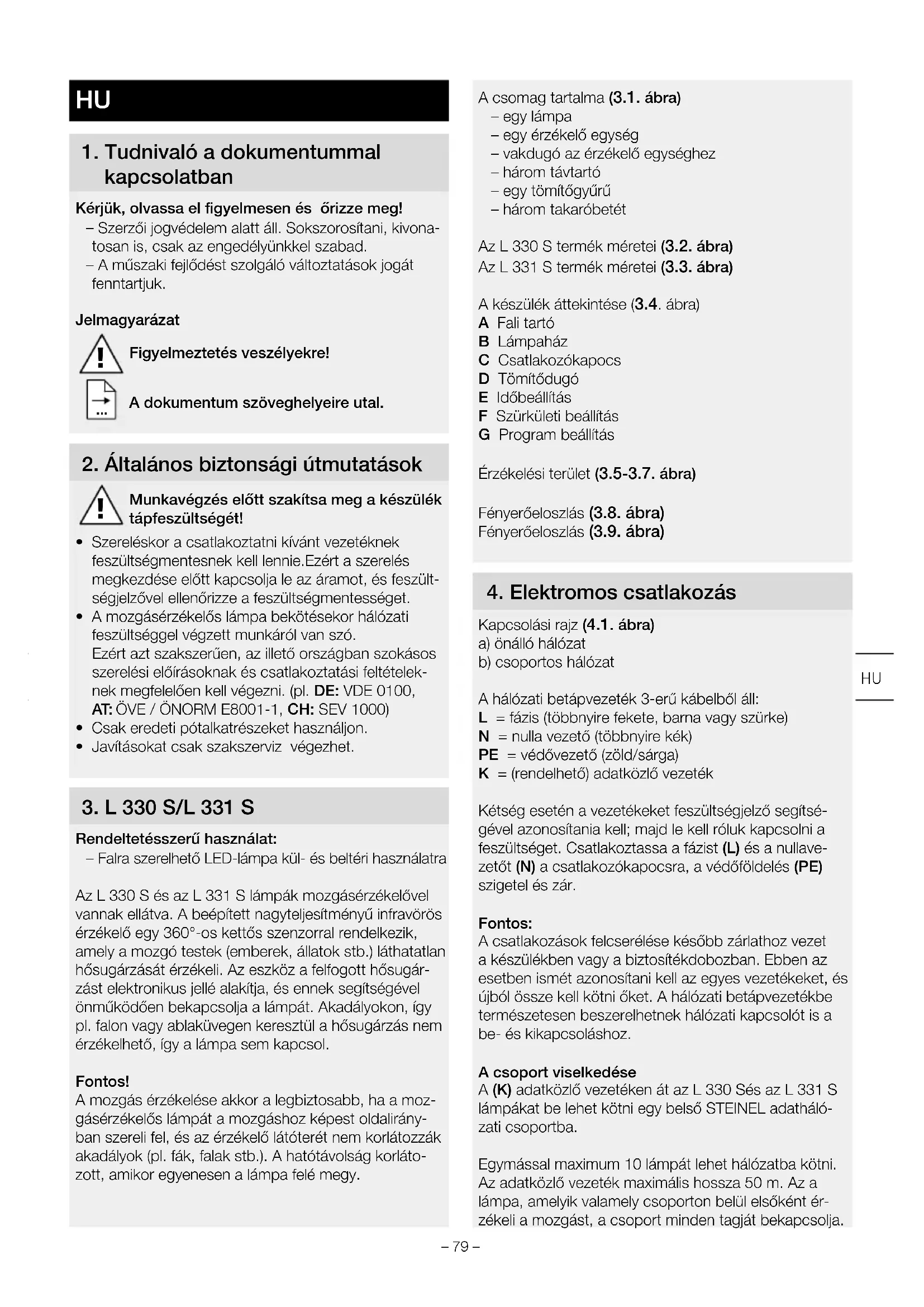 Rendeltetésszerű használat: – Falra szerelhető LED-lámpa kül- és beltéri használatra Az L330 S és az L331 S lámpák mozgásérzékelővel vannak ellátva. A beépített nagyteljesítményű infravörös érzékelő egy 360°-os kettős szenzorral rendelkezik, amely a mozgó testek (emberek, állatok stb.) láthatatlan hősugárzását érzékeli. Az eszköz a felfogott hősugár- zást elektronikus jellé alakítja, és ennek segítségével önműködően bekapcsolja a lámpát. Akadályokon, így pl. falon vagy ablaküvegen keresztül a hősugárzás nem érzékelhető, így a lámpa sem kapcsol. Fontos! A mozgás érzékelése akkor a legbiztosabb, ha a moz- gásérzékelős lámpát a mozgáshoz képest oldalirány- ban szereli fel, és az érzékelő látóterét nem korlátozzák akadályok (pl. fák, falak stb.). A hatótávolság korláto- zott, amikor egyenesen a lámpa felé megy. A csomag tartalma (3.1. ábra) – egy lámpa – egy érzékelő egység – vakdugó az érzékelő egységhez – három távtartó – egy tömítőgyűrű – három takaróbetét Az L330 S termék méretei (3.2. ábra) Az L331 S termék méretei (3.3. ábra) A készülék áttekintése (3.4. ábra) A Fali tartó B Lámpaház C Csatlakozókapocs D Tömítődugó E Időbeállítás F Szürkületi beállítás G Program beállítás Érzékelési terület (3.5-3.7. ábra) Fényerőeloszlás (3.8. ábra) Fényerőeloszlás (3.9. ábra)