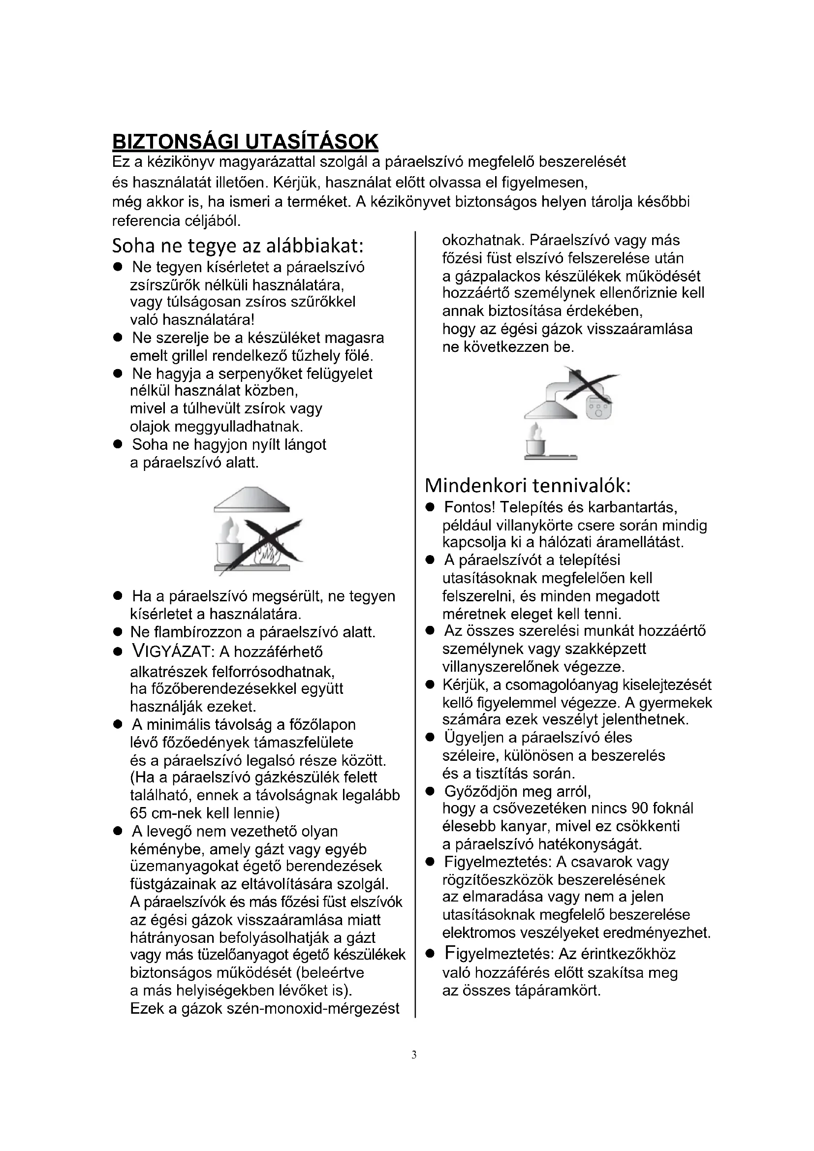 Ez a kézikönyv magyarázattal szolgál a páraelszívó megfelelő beszerelését és használatát illetően. Kérjük, használat előtt olvassa el figyelmesen, még akkor is, ha ismeri a terméket. A kézikönyvet biztonságos helyen tárolja későbbi referencia céljából. Soha ne tegye az alábbiakat: Ne tegyen kísérletet a páraelszívó zsírszűrők nélküli használatára, vagy túlságosan zsíros szűrőkkel való használatára! Ne szerelje be a készüléket magasra emelt grillel rendelkező tűzhely fölé. Ne hagyja a serpenyőket felügyelet nélkül használat közben, mivel a túlhevült zsírok vagy olajok meggyulladhatnak. Soha ne hagyjon nyílt lángot a páraelszívó alatt. Ha a páraelszívó megsérült, ne tegyen kísérletet a használatára. Ne flambírozzon a páraelszívó alatt. VIGYÁZAT: A hozzáférhető alkatrészek felforrósodhatnak, ha főzőberendezésekkel együtt használják ezeket. A minimális távolság a főzőlapon lévő főzőedények támaszfelülete és a páraelszívó legalsó része között. (Ha a páraelszívó gázkészülék felett található, ennek a távolságnak legalább 65 cm-nek kell lennie) A levegő nem vezethető olyan kéménybe, amely gázt vagy egyéb üzemanyagokat égető berendezések füstgázainak az eltávolítására szolgál. A páraelszívók és más főzési füst elszívók az égési gázok visszaáramlása miatt hátrányosan befolyásolhatják a gázt vagy más tüzelőanyagot égető készülékek biztonságos működését (beleértve a más helyiségekben lévőket is). Ezek a gázok szén-monoxid-mérgezést okozhatnak. Páraelszívó vagy más főzési füst elszívó felszerelése után a gázpalackos készülékek működését hozzáértő személynek ellenőriznie kell annak biztosítása érdekében, hogy az égési gázok visszaáramlása ne következzen be. Mindenkori tennivalók: Fontos! Telepítés és karbantartás, például villanykörte csere során mindig kapcsolja ki a hálózati áramellátást. A páraelszívót a telepítési utasításoknak megfelelően kell felszerelni, és minden megadott méretnek eleget kell tenni. Az összes szerelési munkát hozzáértő személynek vagy szakképzett villanyszerelőnek végezze. Kérjük, a csomagolóanyag kiselejtezését kellő figyelemmel végezze. A gyermekek számára ezek veszélyt jelenthetnek. Ügyeljen a páraelszívó éles széleire, különösen a beszerelés és a tisztítás során. Győződjön meg arról, hogy a csővezetéken nincs 90 foknál élesebb kanyar, mivel ez csökkenti a páraelszívó hatékonyságát. Figyelmeztetés: A csavarok vagy rögzítőeszközök beszerelésének az elmaradása vagy nem a jelen utasításoknak megfelelő beszerelése elektromos veszélyeket eredményezhet. Figyelmeztetés: Az érintkezőkhöz való hozzáférés előtt szakítsa meg az összes tápáramkört.4 Mindenkori tennivalók: A gáz főzőlapon történő főzéskor mindig tegyen fedőt az edényekre és serpenyőkre. Elszívó üzemmódban a páraelszívó eltávolítja a helyiség levegőjét. Bizonyosodjon meg arról, hogy eleget tesz a megfelelő szellőzésre vonatkozó követelményeknek. A páraelszívó eltávolítja a szagokat a helyiségből, de a gőzt nem. Ha a páraelszívót gázzal vagy más tüzelőanyaggal működő készülékkel egyidejűleg használják, a helyiségben biztosítsa a megfelelő szellőzést. A páraelszívó kizárólag háztartási célú használatra készült. Ha a tápkábel megsérül, a veszély elkerülése érdekében cseréltesse ki a gyártóval, a gyártó szervizköz- pontjával vagy más szakemberrel. A berendezést 8 évnél idősebb gyermekek vagy csökkent fizikai, érzékszervi vagy mentális képességű, vagy tapasztalattal és ismerettel nem rendelkező személyek akkor használhatják, ha felügyelet alatt állnak vagy ha megfelelő utasításokkal látták el őket a berendezés biztonságos használatát illetően, és megértették a használatból eredő veszélyeket. Gyermekek nem játszhatnak a berendezéssel. A berendezés tisztítását és karbantartását gyermekek csak felügyelet alatt végezhetik. Mindenkori tennivalók: Vigyázat A készülék és az elérhető alkatrészek működés közben felforrósodhatnak. Ügyeljen arra, hogy ne érintse meg a forró elemeket. A 8 évesnél fiatalabb gyermekeknek távol kell maradniuk, kivéve, ha biztosított az állandó felügyelet. Tűzveszélyes, ha a tisztítást nem az utasításoknak megfelelően végzik. Kötelezően tegyen eleget a levegő kibocsátására vonatkozó szabályoknak. Rendszeresen tisztítsa a készüléket a KARBANTARTÁS című fejezetben leírt módszer szerint. Biztonsági okokból csak a jelen kézikönyvben ajánlott méretű rögzítőelemet vagy rögzítőcsavart használja. A tisztítás módjával és gyakoriságával kapcsolatos részletek ügyében lásd a kézikönyv karbantartási és tisztítási részét. A berendezés tisztítását és karbantartását gyermekek csak felügyelet alatt végezhetik. Amikor a páraelszívó és az elektromos áramtól eltérő energiával működő készülékek egyidejűleg működnek, a helyiségben a negatív nyomás nem haladhatja meg a 4 Pa (4 x 10