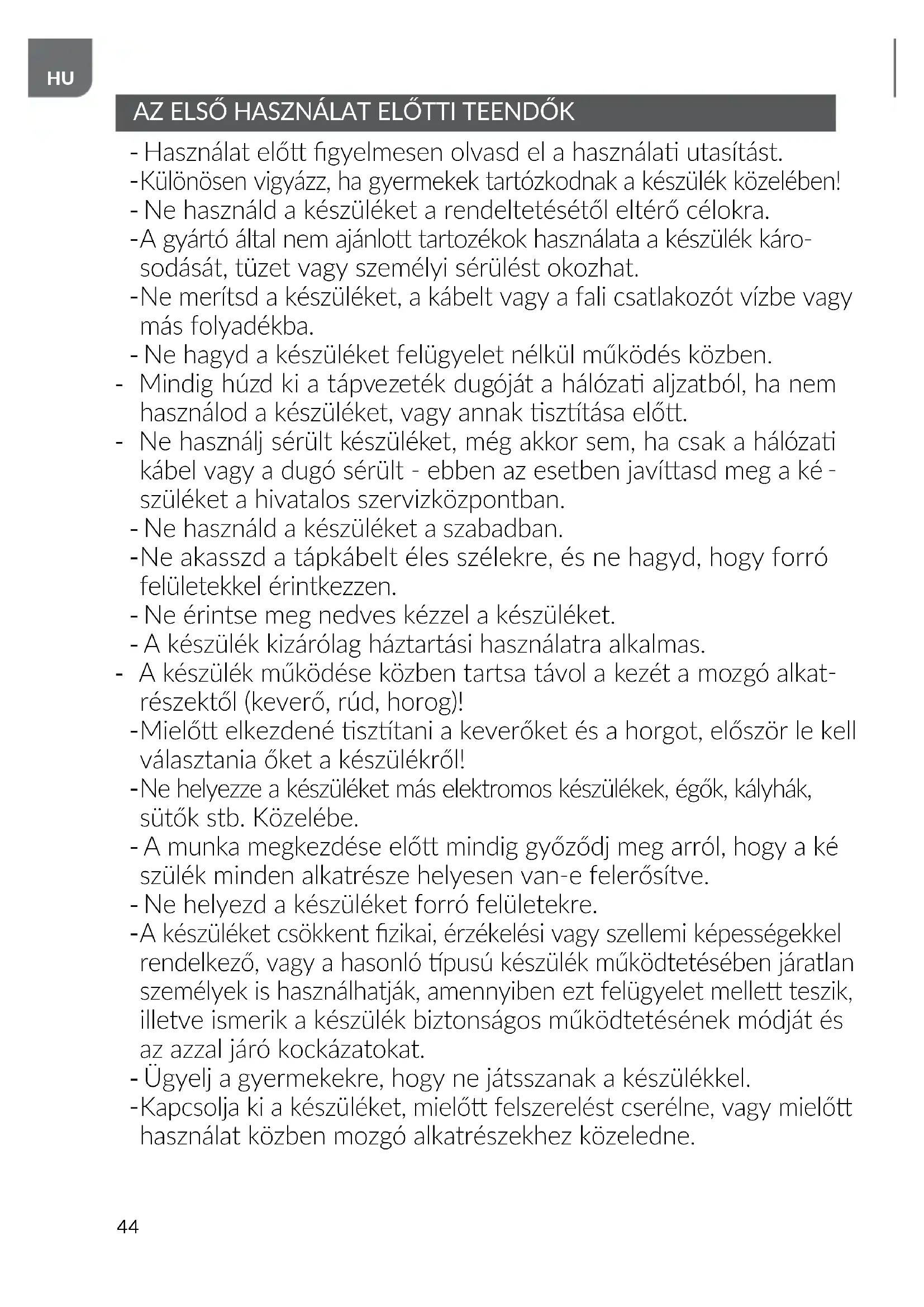 Különösen vigyázz, ha gyermekek tartózkodnak a készülék közelében! - Ne használd a készüléket a rendeltetésétől eltérő célokra.