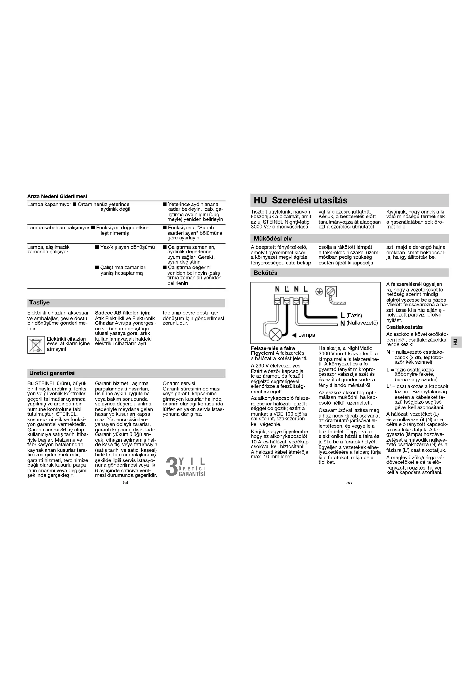 HU Szerelési utasítás Tisztelt ügyfelünk, nagyon köszönjük a bizalmát, amit az új STEINEL NightMatic 3000 Vario megvásárlásá-val kifejezésre juttatott. Kérjük, a beszerelés előtt tanulmányozza át alaposan ezt a szerelési útmutatót. Kívánjuk, hogy ennek a ki-váló minőségű terméknek a használatában sok örö-mét leljeA beépített fényérzékelő, amely figyelemmel kíséri a környezet megvilágítási fényerősségét, este bekap-csolja a rákötött lámpát, a takarékos éjszakai üzem-módban pedig szükség esetén újból kikapcsolja azt, majd a derengő hajnali órákban ismét bekapcsol-ja, ha így állították be.Felszerelés a falra Figyelem! A felszerelés a hálózatra kötést jelenti. A 230 V életveszélyes! Ezért először kapcsolja le az áramot, és feszült-ségjelző segítségével ellenőrizze a feszültség-mentességet! Az alkonykapcsoló felsze-relésekor hálózati feszült-séggel dolgozik; ezért a munkát a VDE 100 előírá-sai szerint, szakszerűen kell végeznie. Kérjük, vegye figyelembe, hogy az alkonykapcsolót 10 A-es hálózati védőkap-csolóval kell biztosítani! A hálózati kábel átmérője max. 10 mm lehet.Ha akarja, a NightMatic 3000 Vario-t közvetlenül a lámpa mellé is felszerelhe-ti. A környezet és a fo-gyasztó fényét mikropro-cesszor választja szét és és ezáltal gondoskodik a fény állandó méréséről. Az eszköz akkor fog opti-málisan működni, ha kap-csoló nélkül üzemelteti. Csavarhúzóval lazítsa meg a ház négy darab csavarját az óramutató járásával el-lentétesen, és vegye le a ház fedelét. Tegye rá az elektronika házát a falra és jelölje be a furatok helyét; ügyeljen a vezetékek elhe-lyezkedésére a falban; fúrja ki a furatokat; rakja be a tipliket. A felszerelésnél ügyeljen rá, hogy a vezetékeket le-hetőség szerint mindig alulról vezesse be a házba. Mielőtt felcsavarozná a há-zat, üsse ki a ház alján el-helyezett páravíz-lefolyó nyílást. Csatlakoztatás Az eszköz a következőkép-pen jelölt csatlakozásokkal rendelkezik: N = nullavezető csatlako-zások (2 db, legtöbb-ször kék színnel) L = fázis csatlakozás (többnyire fekete, barna vagy szürke) L' = csatlakozás a kapcsolt fázisra. Bizonytalanság esetén a kábeleket fe-szültségjelző segítsé-gével kell azonosítani. A hálózati vezetéket (L) és a nullavezetőt (N) az e célra előirányzott kapcsok-ra csatlakoztatjuk. A fo-gyasztó (lámpa) hozzáve-zetését a második nullave-zető csatlakozásra (N) és a fázisra (L') csatlakoztatjuk. A meglévő zöld/sárga vé-dővezetőket e célra elő-irányzott rögzítési helyen kell a kapocsra szorítani. Működési elv Bekötés Lámpa(Fázis)(Nullavezető)Lamba kapanmıyor n Ortam henüz yeterince aydınlık değiln Yeterince aydınlanana kadar bekleyin, icab. ça-lıştırma aydınlığını (düğ-meyle) yeniden belirleyinLamba sabahları çalışmıyor n Fonksiyon doğru etkin-leştirilmemişn Fonksiyonu, "Sabah saatleri ayarı" bölümüne göre ayarlayınLamba, alışılmadık zamanda çalışıyorn Yaz/kış ayarı dönüşümü