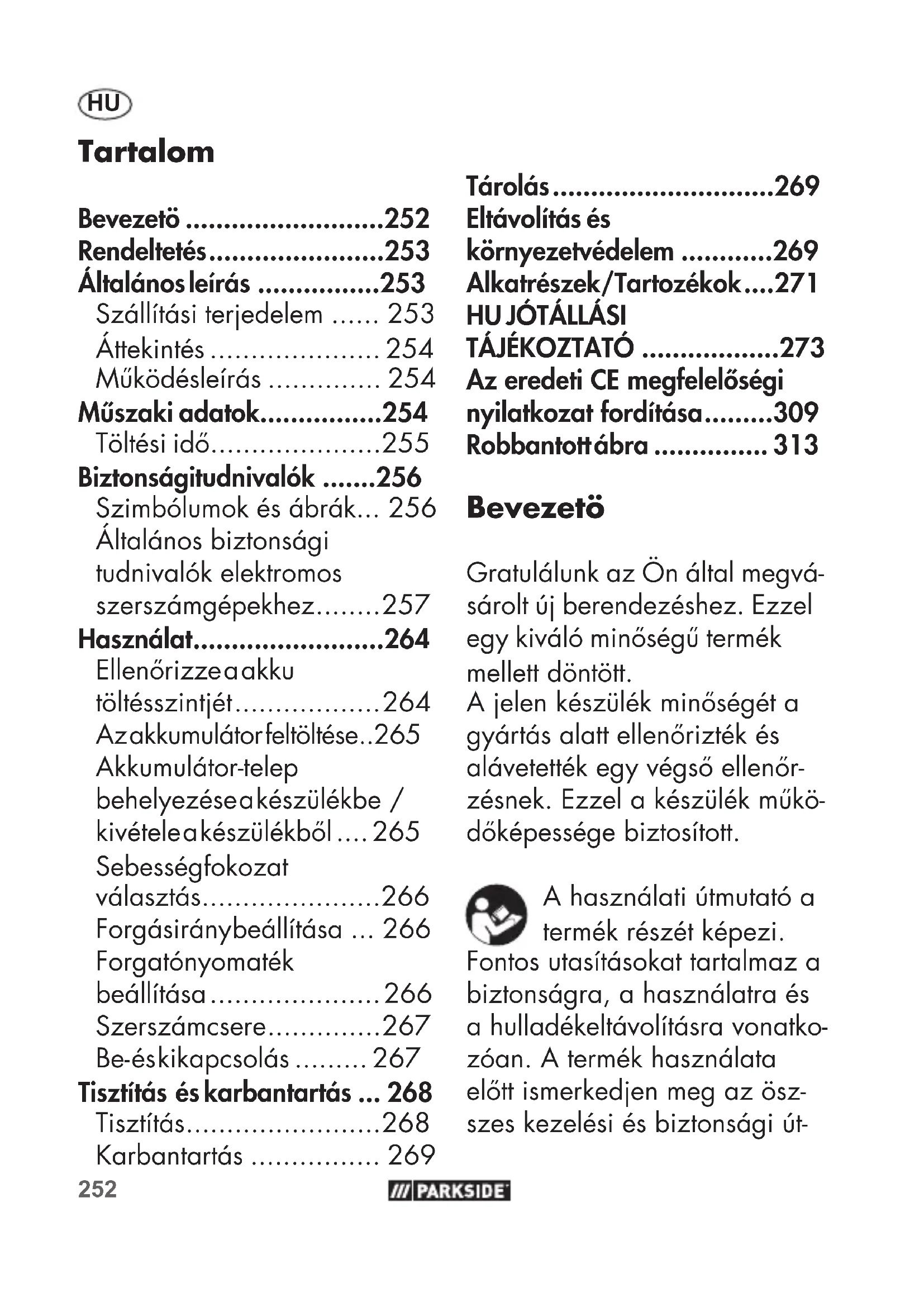 - Biztonsági tudnivalók p. 256