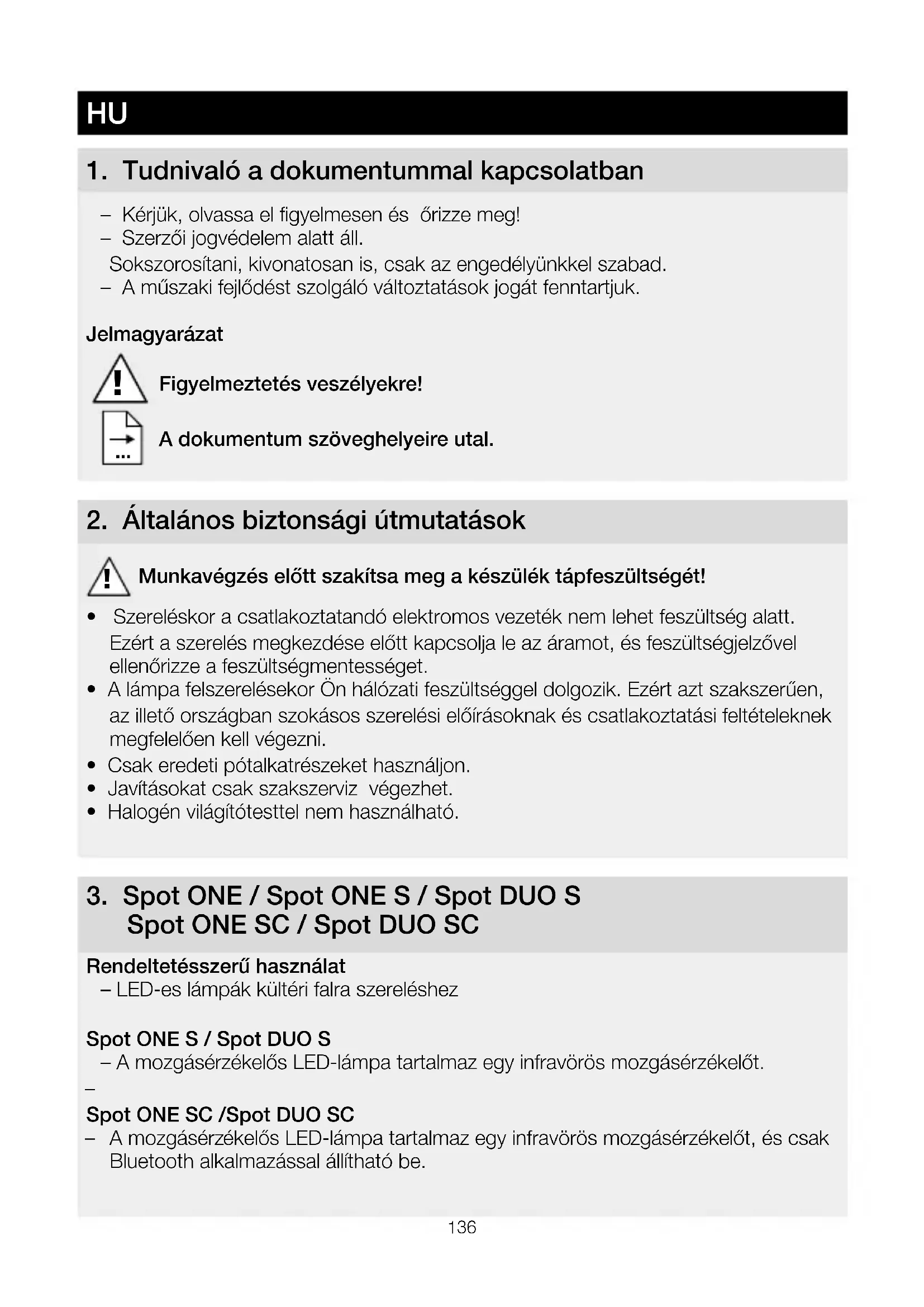 Spot ONESC / Spot DUO SC Rendeltetésszerű használat – LED-es lámpák kültéri falra szereléshez Spot ONES / Spot DUOS – A mozgásérzékelős LED-lámpa tartalmaz egy infravörös mozgásérzékelőt.