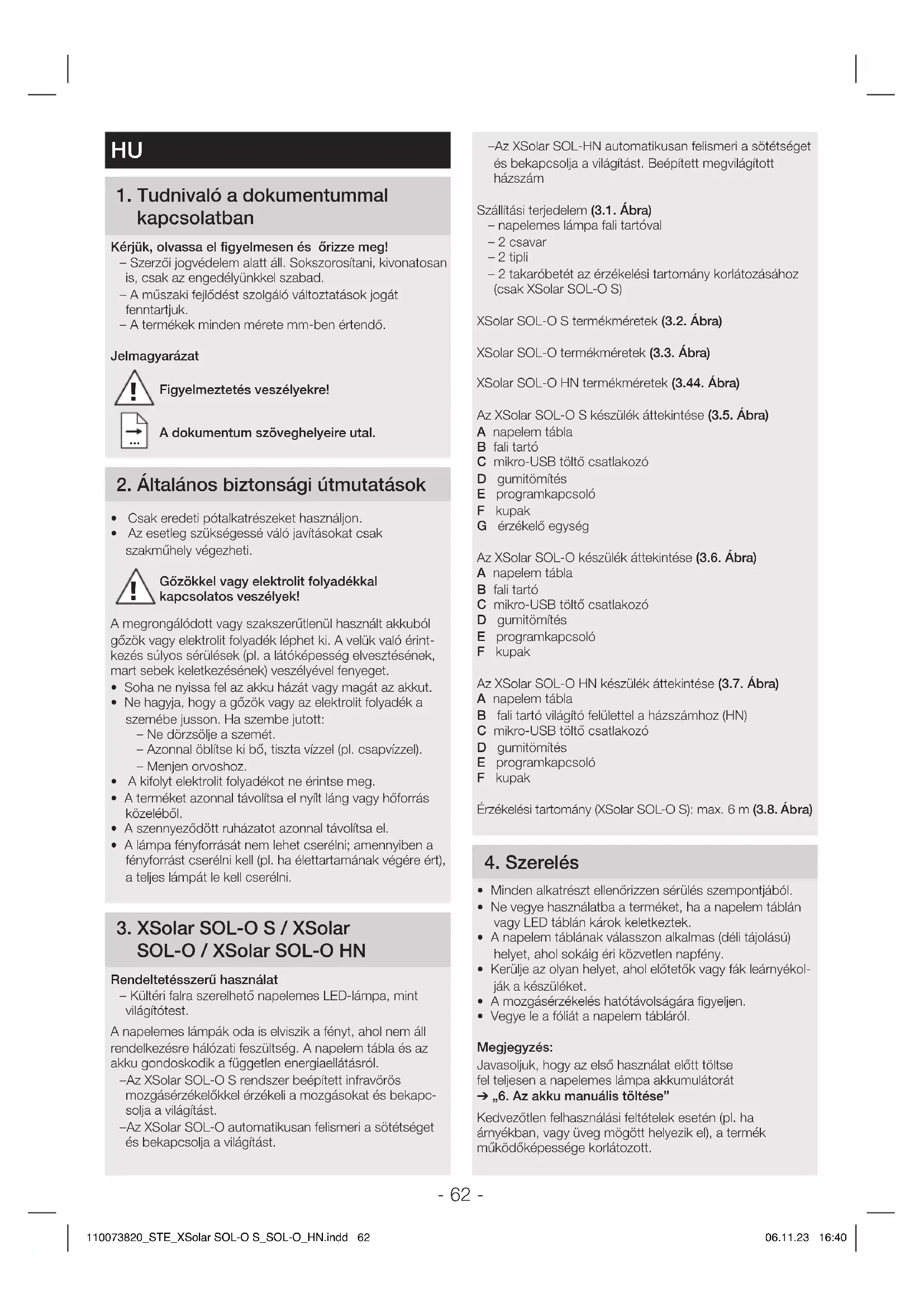110073820_STE_XSolar SOL-O S_SOL-O_HN.indd 63110073820_STE_XSolar SOL-O S_SOL-O_HN.indd 63 06.11.23 16:4006.11.23 16:40- 64 - 8 Ártalmatlanítás Gondoskodjon az elektromos készülékek, a tartozékok és a csomagolás környezetbarát újrahasznosításáról. Ne dobjon elektromos készülékeket a háztartási szemétbe!Csak az EU-országok esetébenA használt elektromos és elektronikus berendezésekre vonatkozó hatályos európai irányelvek értelmében és azok nemzeti jogrendszerbe történő átültetése szerint a már nem működőképes elektromos berendezéseket külön kell gyűjteni és környezetbarát újrahasznosításukról kell gondoskodni. Az elhasználódott készülékeket, akkumulátoro-kat/elemeket ne dobja ki a háztartási szeméttel, és ne is dobja tűzbe vagy vízbe. Az akkumuláto-rokat/elemeket külön kell összegyűjteni, újrahasznosítani, vagy környezetbarát módon ártalmatlanítani.Csak az EU-országok esetébenAz RL 2006/66/EK irányelv szerint a hibás vagy elhaszná-lódott akkumulátorokat/elemeket újra kell hasznosítani. A már nem használható akkumulátorok/elemek leadhatók az értékesítési helyen vagy a károsanyag-gyűjtőhelyen. 9 Gyári garancia Gyártói garancia STEINEL GmbH, Dieselstrasse 80-84, DE-33442 Herzebrock-Clarholz, NémetországEzt a Steinel-terméket a legnagyobb gondossággal gyártották, működését és biztonságosságát az érvényes előírások szerint bevizsgálták, majd szúrópróba szerűen ellenőrizték. A Steinel garanciát vállal a kifogástalan minőségre és működésre. A garancia ideje 36hónap, ami a vásárlás napján kezdődik. Minden olyan hibát kijavítunk, ami anyag- vagy gyártási hibára vezethető vissza. A garancia teljesítésének módját mi választjuk meg: ez lehet a hibás alkatrész megjavítása vagy kicserélése. A garancia nem vonatkozik a kopóalkatrészeken bekövet-kező károkra, valamint az olyan károkra és hiányosságokra, amelyek a szakszerűtlen kezelés vagy karbantartás miatt következnek be. Idegen objektumokon keletkező következ-ményes károk ki vannak zárva a garancia köréből.Garanciát csak akkor vállalunk, ha a készüléket szétszerele-tlen állapotban jól becsomagolják, mellékelik a hiba rövid leírását, a (vásárlás időpontjával és a kereskedő pecsétjével ellátott) pénztárblokkot vagy számlát, és ezeket elküldik az illetékes szerviznek. Javító szolgálat: A garanciaidő lejárta után, vagy a garancia hatálya alá nem tartozó hiányosságok esetén tudakolja meg az Önhöz legkö-zelebb eső szervizünkben, hogy milyen lehetőségei vannak a helyreállításra. 10 Műszaki adatok A napelemes lámpa műszaki adatai XSolar SOL-O S XSolarSOL-O XSolarSOL-OHN Méretek Szé×Ma×Mé(mm) 242×53×91 242×38×91 242×183×91Teljesítmény max. 3,3W max.0,1W max.0,1WÉrzékelési szög 360° - -Érzékelési hatótávolság max. 6m - -Szürkületi beállítás 2Lux Időtartam-beállítás 10 – 30mp automatikus - - Éjszakai fény 3% - - Fényáram max. 273lm max. 7,5lm max. 7,5lm Hatásfok 83lm/W 75lm/W 75lm/WSzínhőmérséklet 3.000KLED-ek élettartama 50.000óraVédettségi mód IP44Védettségi osztály IIIHőmérséklettartomány -20°Cés+40°CközöttAkku műszaki adatai XSolarSOL-OSXSolarSOL-O XSolarSOL-OHNTípus Lítium vasfoszfát (LiFePO4)Kapacitás 2×2.000mAH 2.000mAH 2.000mAHMax. élettartam éjszakánként 20-szori kapcsolás mellett 20napMikro USB töltő csatlakozó 5V,max.1A