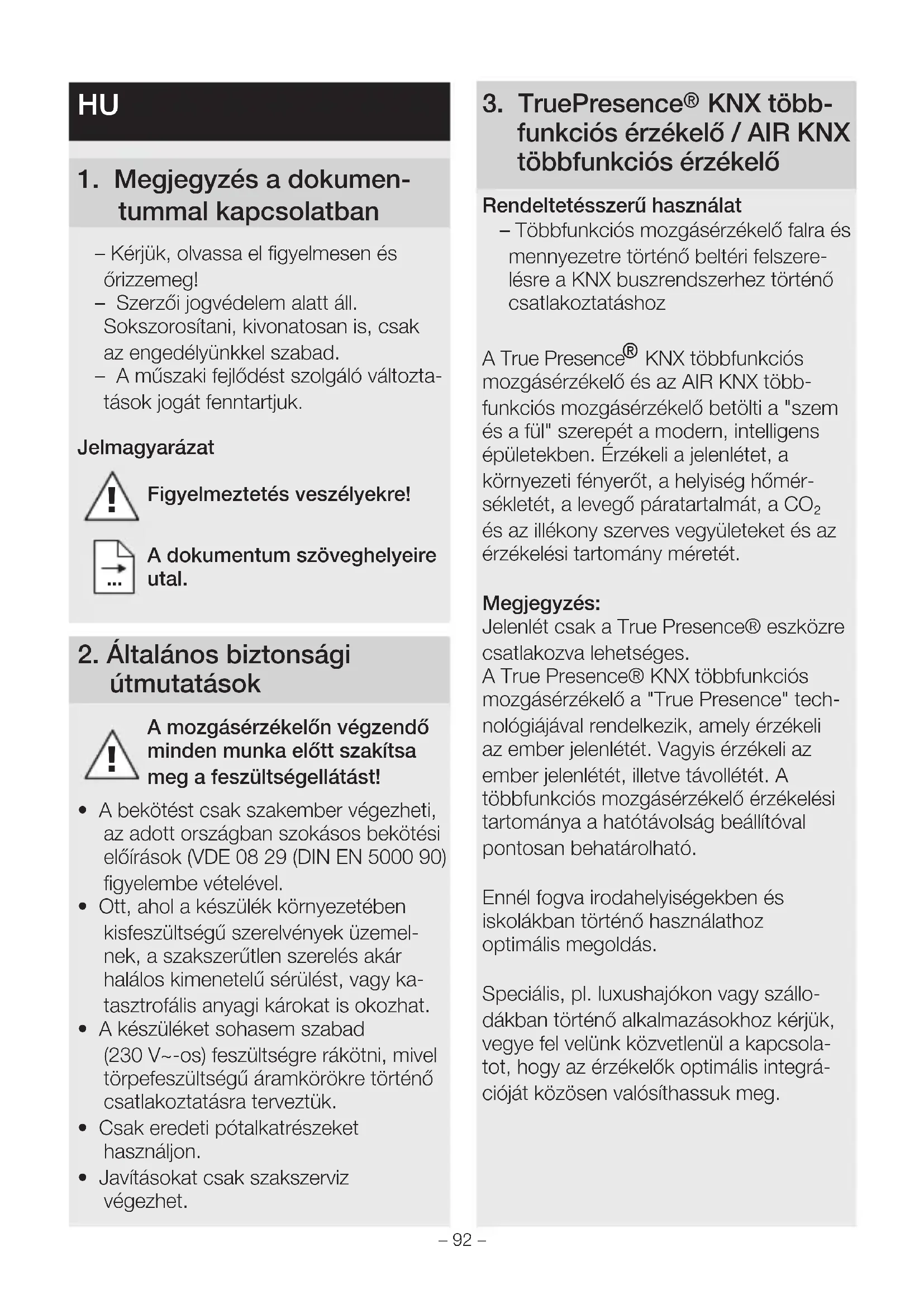 KNX több- funkciós érzékelő/AIR KNX többfunkciós érzékelő Rendeltetésszerű használat – Többfunkciós mozgásérzékelő falra és mennyezetre történő beltéri felszere- lésre a KNX buszrendszerhez történő csatlakoztatáshoz A True Presence