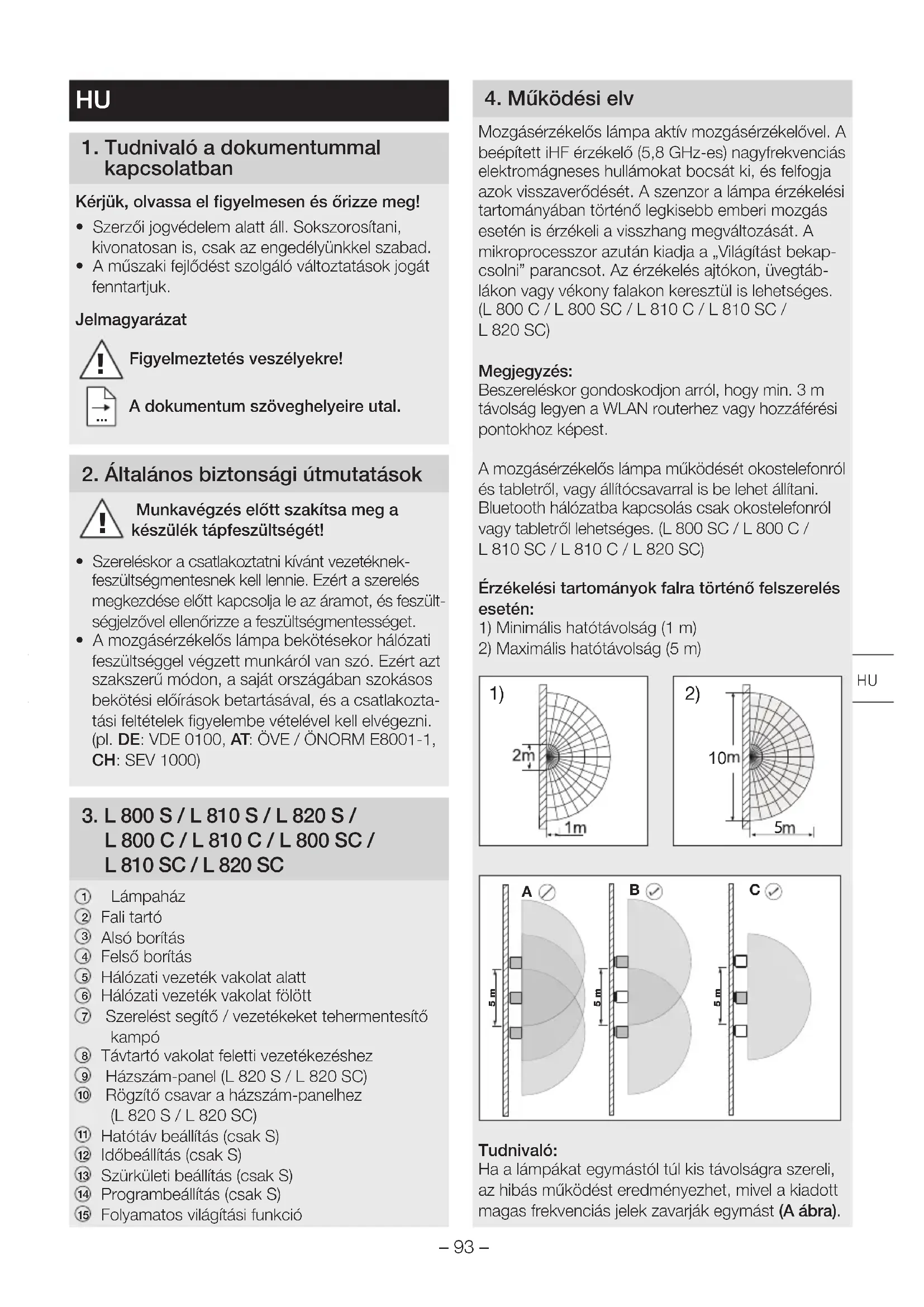 Mozgásérzékelős lámpa aktív mozgásérzékelővel. A beépített iHF érzékelő (5,8 GHz-es) nagyfrekvenciás elektromágneses hullámokat bocsát ki, és felfogja azok visszaverődését. A szenzor a lámpa érzékelési tartományában történő legkisebb emberi mozgás esetén is érzékeli a visszhang megváltozását. A mikroprocesszor azután kiadja a „Világítást bekap-csolni” parancsot. Az érzékelés ajtókon, üvegtáb-lákon vagy vékony falakon keresztül is lehetséges. (L800C / L800SC / L810C / L810SC / L820SC)Megjegyzés:Beszereléskor gondoskodjon arról, hogy min. 3 m távolság legyen a WLAN routerhez vagy hozzáférési pontokhoz képest.A mozgásérzékelős lámpa működését okostelefonról és tabletről, vagy állítócsavarral is be lehet állítani. Bluetooth hálózatba kapcsolás csak okostelefonról vagy tabletről lehetséges. (L800SC/ L800C/ L810SC/ L810C/ L820SC)Érzékelési tartományok falra történő felszerelés esetén:1) Minimális hatótávolság (1m)2) Maximális hatótávolság (5m)
