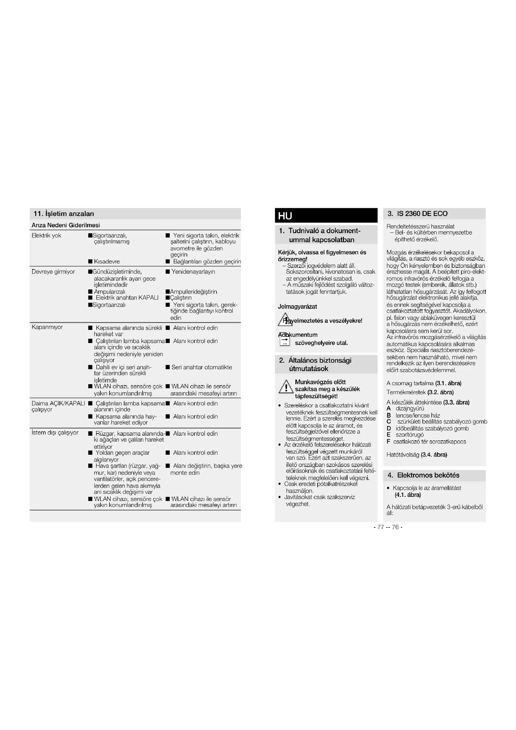 Zavar Oka ElhárításaNem kap feszültségetn a biztosíték hibás, nincs bekapcsolvan rövidzárlatn új biztosíték, hálózati kapcsolót bekapcsolni; vezetéket feszültségjelző-vel átvizsgálnin csatlakozókat ellenőrizniNem kapcsol ben nappali üzemnél a szürkü-leti érték éjszakai üzemre van beállítvan izzólámpa kiégettn hálózati kapcsoló kikap-csolvan biztosíték hibásn újra beállítanin izzókat kicserélnin bekapcsolnin új biztosíték, esetleg csatlakozót ellenőrizniNem kapcsol kin folyamatos mozgás az érzékelési területenn a kapcsolt lámpa az érzé-kelési területen található, és a hőmérsékletváltozás hatására újra kapcsoln a ház soros kapcsolója tartós üzemre van kapcsolvan helyezze a WLAN készüléket nagyon közel az érzékelőhözn területet ellenőriznin területet ellenőrizni n soros kapcsoló automati-kus állásban n növelje a WLAN készülék és az érzékelő közötti távolságotÁllandóan KI/BE kapcsoln a kapcsolt lámpa az érzé-kelési területen találhatón állatok mozognak az érzékelési területenn területet ellenőrizni n területet ellenőrizniSzükségtelenül bekapcsoln az érzékelési területen szél mozgatja a fákat és bokrokatn az utcán elhaladó autók érzékelésen az időjárás (szél, eső, hó), vagy a ventilátorokból, nyi-tott ablakokon át kiáramló levegő miatt a hőmérséklet hirtelen változikn helyezze a WLAN készüléket nagyon közel az érzékelőhözn területet ellenőrizni n területet ellenőrizni n területet megváltoztatni, a felszerelés helyét áthelyezni n növelje a WLAN készülék és az érzékelő közötti távolságot