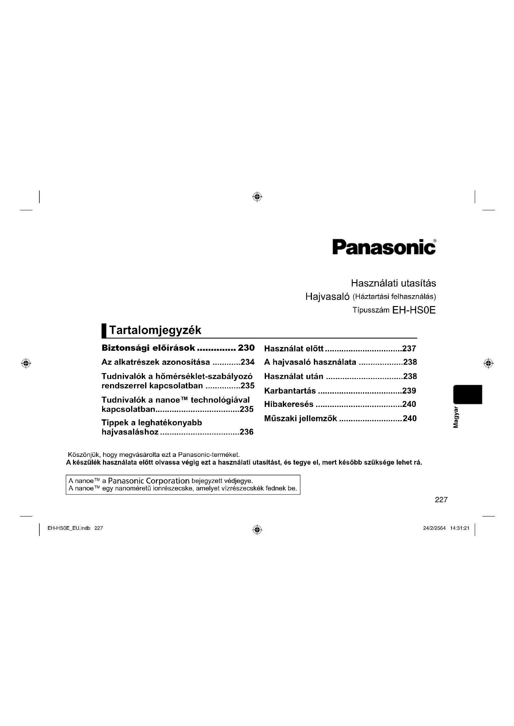 - Műszaki jellemzők EH-HS0E_EU.indb 227EH-HS0E_EU.indb 227 24/2/2564 14:31:2124/2/2564 14:31:21228 Magyar FIGYELEM p. 240