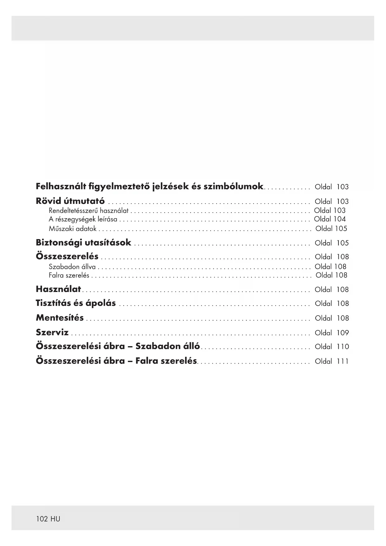 Felhasznált figyelmeztető jelzések és szimbólumok............. Oldal 103 Rövid útmutató ....................................................... Oldal 103 Rendeltetésszerű használat ................................................. Oldal 103 A részegységek leírása .................................................... Oldal 104 Műszaki adatok .......................................................... Oldal 105 Biztonsági utasítások ................................................ Oldal 105 Összeszerelés ......................................................... Oldal 108 Szabadon állva .......................................................... Oldal 108 Falra szerelés ............................................................ Oldal 108 Használat.............................................................. Oldal 108 Tisztítás és ápolás .................................................... Oldal 108 Mentesítés ............................................................. Oldal 108 Szerviz ................................................................. Oldal 109 Összeszerelési ábra – Szabadon álló.............................. Oldal 110 Összeszerelési ábra – Falra szerelés............................... Oldal 111103