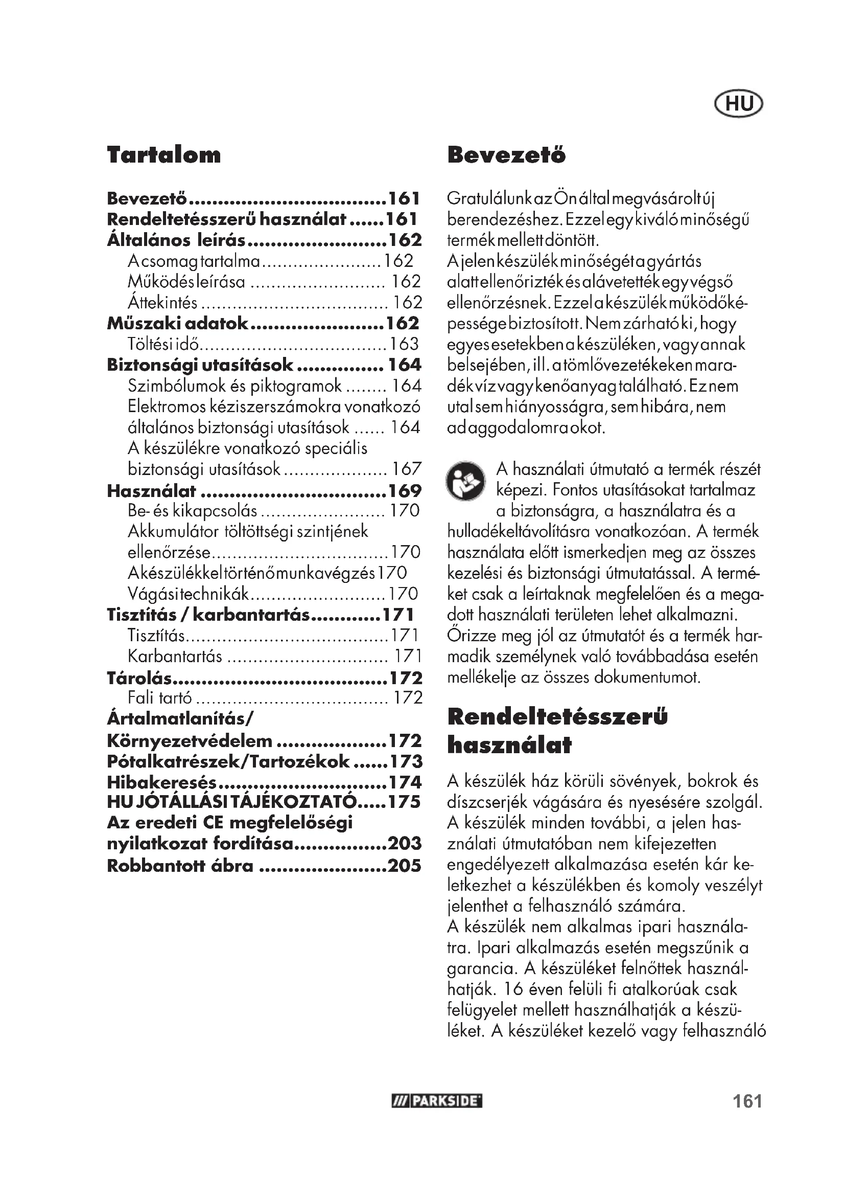 - Bevezető Gratulálunk az Ön által megvásárolt új berendezéshez. Ezzel egy kiváló minőségű termék mellett döntött. A jelen készülék minőségét a gyár tás alatt ellenőrizték és alávetették egy végső ellenőrzésnek. Ezzel a készülék működőké- pessége biztosítot t. Nem zárható ki, hogy egyes esetekben a készüléken, vagy annak belsejében, il l. a tömlővezetékeken mara- dék víz vagy kenőanyag található. Ez nem utal sem hiányosságra, sem hibára, nem ad aggodalomra okot. A használati útmutató a termék részét képezi. Fontos utasításokat tartalmaz a biztonságra, a használatra és a hulladékeltávolításra vonatkozóan. A termék használata előtt ismerkedjen meg az összes kezelési és biztonsági útmutatással. A termé- ket csak a leírtaknak megfelelően és a mega- dott használati területen lehet alkalmazni. Őrizze meg jól az útmutatót és a termék har- madik személynek való továbbadása esetén mellékelje az összes dokumentumot. Rendeltetésszerű használat A készülék ház körüli sövények, bokrok és díszcserjék vágására és nyesésére szolgál. A készülék minden további, a jelen has- ználati útmutatóban nem kifejezetten engedélyezett alkalmazása esetén kár ke- letkezhet a készülékben és komoly veszélyt jelenthet a felhasználó számára. A készülék nem alkalmas ipari használa- tra. Ipari alkalmazás esetén megszűnik a garancia. A készüléket felnőttek használ- hatják. 16 éven felüli atalkorúak csak felügyelet mellett használhatják a készü- léket. A készüléket kezelő vagy felhasználó Az eredeti CE megfelelőségi nyilatkozat fordítása p. 203