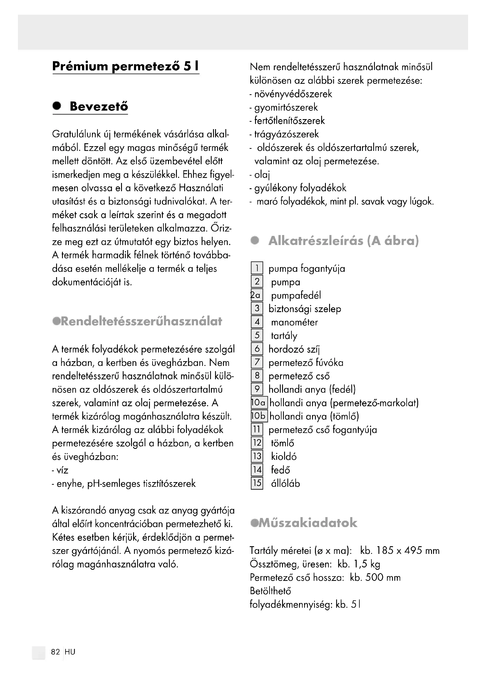 Riempire con liquido per spray. L’impostazione della testina di spruzzo è tra 2 funzioni di spruzzo. Accertarsi che la testina di spruzzo sia correttamente regolata. Smaltimento La confezione è prodotta in materiale ricicla- bile e biodegradabile, smaltibile nei luoghi di raccolta differenziati. Potete informarvi sulle possibilità di smaltime nto del prodotto consumato dall‘amministrazione comunale e cittadina. Assistenza Assistenza Italia Tel.: 800790789 E-Mail: owim@lidl.it81 HU Bevezető ...............................................................................................................Oldal 82 Rendeltetésszerű használat .....................................................................................Oldal 82 Alkatrészleírás ..........................................................................................................Oldal 82 Műszaki adatok .......................................................................................................Oldal 82 A szállítmány tartalma .............................................................................................Oldal 83 Biztonsági tudnivalók ...............................................................................Oldal 83 Általános biztonsági tudnivalók ..............................................................................Oldal 83 Az üzembevétel előtt .................................................................................Oldal 84 Üzembe helyezés .......................................................................................... Oldal 84 A szórócső szerelése ...............................................................................................Oldal 84 A túlnyomásos permetező tartályának feltöltése ...................................................Oldal 85 Üzemi nyomás létrehozása .....................................................................................Oldal 85 Permetezés ...............................................................................................................Oldal 85 A túlnyomásos permetező szállítása ...........................................Oldal 86 Tisztítás és ápolás .........................................................................................Oldal 86 A túlnyomásos pemetező tisztítása .........................................................................Oldal 86 A tömlő és a pumpa tisztítása .................................................................................Oldal 86 A szűrő tisztítása ......................................................................................................Oldal 87 A túlnyomásos permetező tárolása ........................................................................Oldal 87 Hibák elhárítása ............................................................................................Oldal 87 Megsemmisítés ................................................................................................Oldal 88 Szerviz ....................................................................................................................Oldal 88 Jótállási Tájékoztató ..................................................................................Oldal 8982 HU Prémium permetező 5 l Bevezető Gratulálunk új termékének vásárlása alkal- mából. Ezzel egy magas minőségű termék mellett döntött. Az első üzembevétel előtt ismerkedjen meg a készülékkel. Ehhez figyel- mesen olvassa el a következő Használati utasítást és a biztonsági tudnivalókat. A ter- méket csak a leírtak szerint és a megadott felhasználási területeken alkalmazza. Őriz- ze meg ezt az útmutatót egy biztos helyen. A termék harmadik félnek történő továbba- dása esetén mellékelje a termék a teljes dokumentációját is. Rendeltetésszerű használat A termék folyadékok permetezésére szolgál a házban, a kertben és üvegházban. Nem rendeltetésszerű használatnak minősül külö- nösen az oldószerek és oldószertartalmú szerek, valamint az olaj permetezése. A termék kizárólag magánhasználatra készült. A termék kizárólag az alábbi folyadékok permetezésére szolgál a házban, a kertben és üvegházban: - víz - enyhe, pH-semleges tisztítószerek A kiszórandó anyag csak az anyag gyártója által előírt koncentrációban permetezhető ki. Kétes esetben kérjük, érdeklődjön a permet- szer gyártójánál. A nyomós permetező kizá- rólag magánhasználatra való. Nem rendeltetésszerű használatnak minősül különösen az alábbi szerek permetezése: - növényvédőszerek - gyomirtószerek - fertőtlenítőszerek - trágyázószerek - oldószerek és oldószertartalmú szerek, valamint az olaj permetezése. - olaj - gyúlékony folyadékok - maró folyadékok, mint pl. savak vagy lúgok. Alkatrészleírás (A ábra)