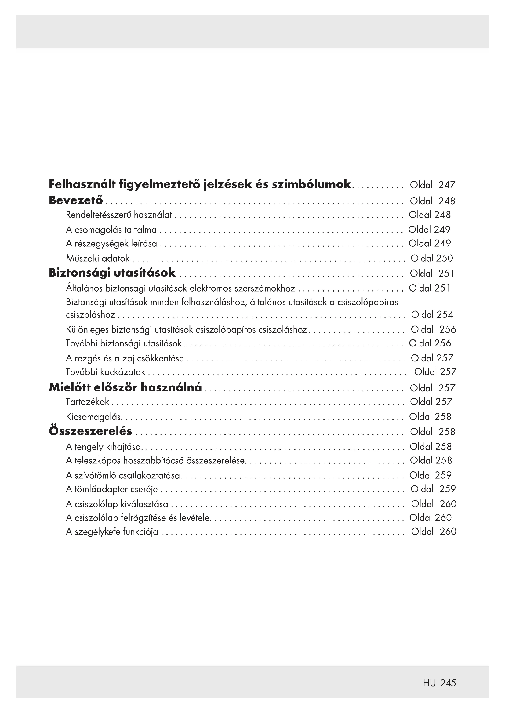 Felhasznált figyelmeztető jelzések és szimbólumok........... Oldal 247 Bevezető ............................................................. Oldal 248 Rendeltetésszerű használat ............................................... Oldal 248 A csomagolás tartalma .................................................. Oldal 249 A részegységek leírása .................................................. Oldal 249 Műszaki adatok ........................................................ Oldal 250 Biztonsági utasítások .............................................. Oldal 251 Általános biztonsági utasítások elektromos szerszámokhoz ...................... Oldal 251 Biztonsági utasítások minden felhasználáshoz, általános utasítások a csiszolópapíros csiszoláshoz ........................................................... Oldal 254 Különleges biztonsági utasítások csiszolópapíros csiszoláshoz .................... Oldal 256 További biztonsági utasítások ............................................. Oldal 256 A rezgés és a zaj csökkentése ............................................. Oldal 257 További kockázatok ..................................................... Oldal 257 Mielőtt először használná ......................................... Oldal 257 Tartozékok ............................................................ Oldal 257 Kicsomagolás.......................................................... Oldal 258 Összeszerelés ....................................................... Oldal 258 A tengely kihajtása...................................................... Oldal 258 A teleszkópos hosszabbítócső összeszerelése................................. Oldal 258 A szívótömlő csatlakoztatása.............................................. Oldal 259 A tömlőadapter cseréje .................................................. Oldal 259 A csiszolólap kiválasztása ................................................ Oldal 260 A csiszolólap felrögzítése és levétele........................................ Oldal 260 A szegélykefe funkciója .................................................. Oldal 260246