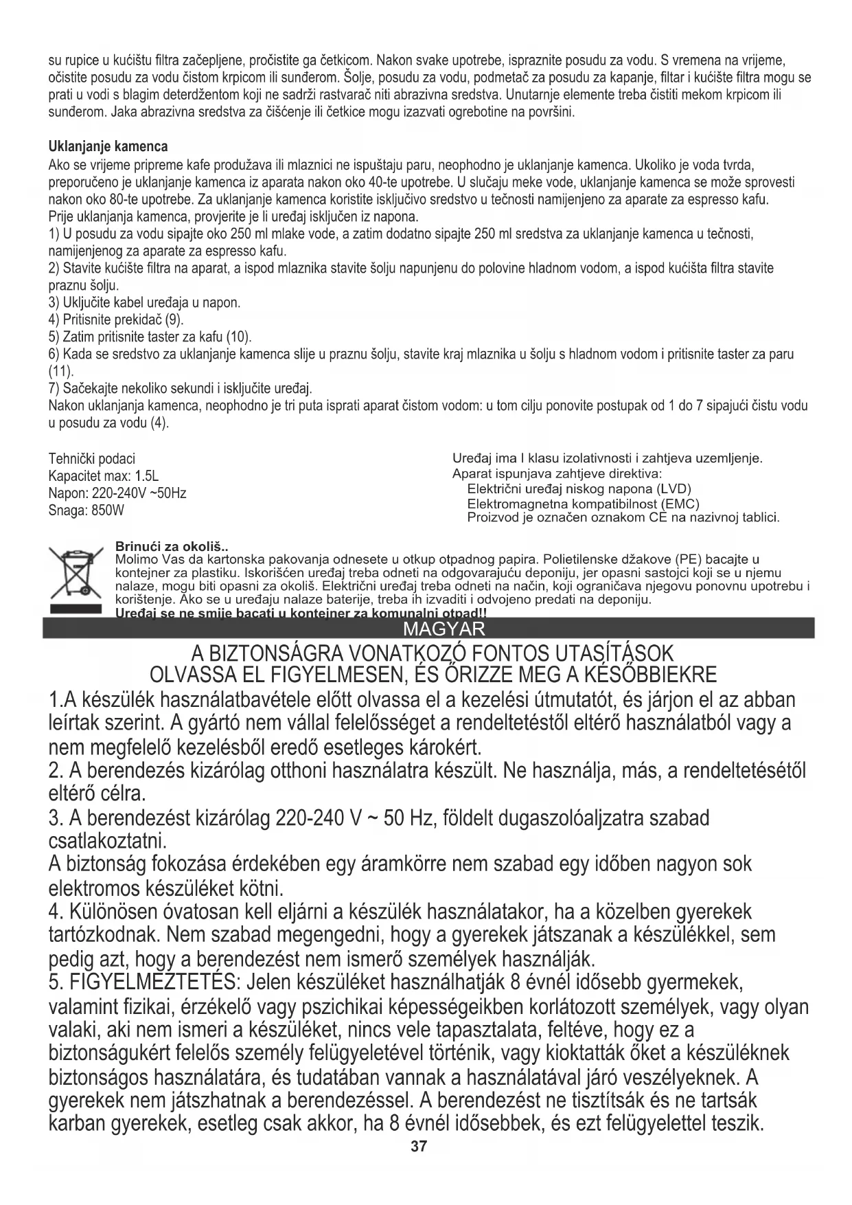 Vízkőtelenítés után a kávéfőzőt tiszta vízzel háromszor ki kell öblíteni: ehhez ismételje meg az 1-7 tevékenységet megtöltve a víztartályt (4) tiszta vízzel. MŰSZAKI ADATOK: Kapacitás max: 1.5 l Feszültség: 220-240V ~ 50Hz