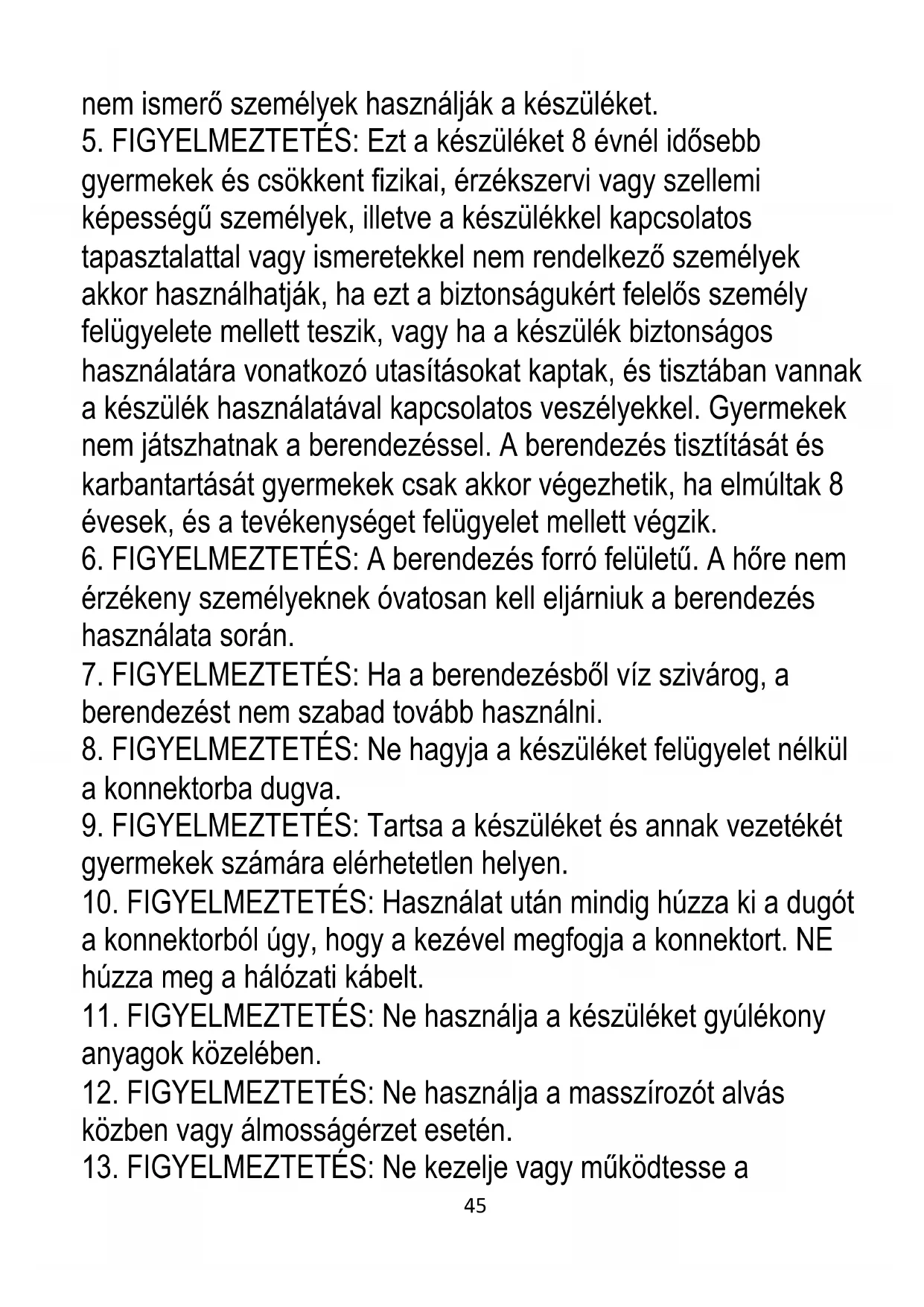 gyermekek és csökkent fizikai, érzékszervi vagy szellemi képességű személyek, illetve a készülékkel kapcsolatos tapasztalattal vagy ismeretekkel nem rendelkező személyek akkor használhatják, ha ezt a biztonságukért felelős személy felügyelete mellett teszik, vagy ha a készülék biztonságos használatára vonatkozó utasításokat kaptak, és tisztában vannak a készülék használatával kapcsolatos veszélyekkel. Gyermekek nem játszhatnak a berendezéssel. A berendezés tisztítását és karbantartását gyermekek csak akkor végezhetik, ha elmúltak 8 évesek, és a tevékenységet felügyelet mellett végzik.