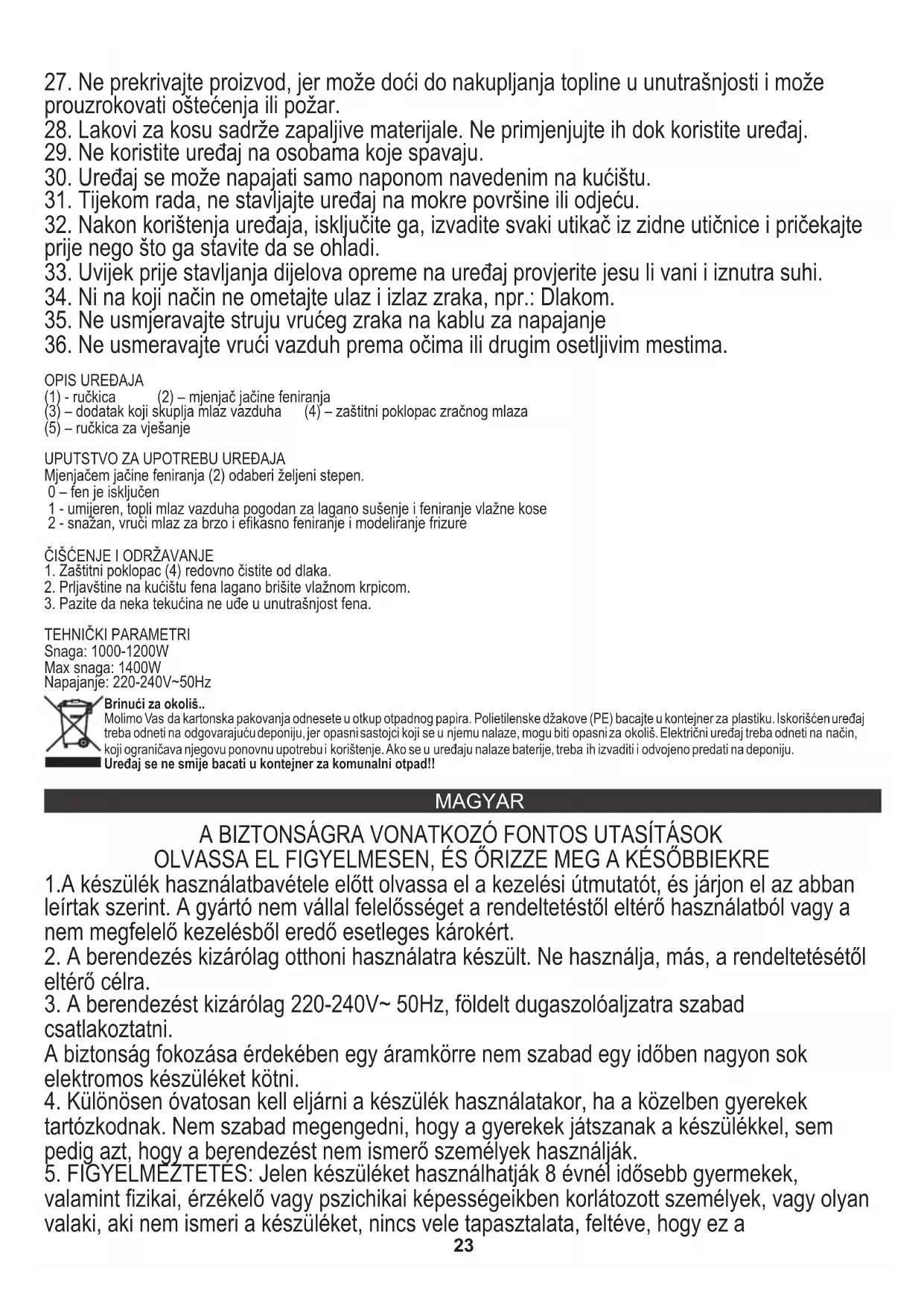 Tápfeszültség: 220-240V~50Hz A környezet védelme érdekében kérjük külön karton dobozok és műanyag zsákokat és dobja őket a megfelelő hulladék közé. Használt készüléket kell eljuttatni a kijelölt gyűjtőhelyekre miatt veszélyes elemek alkatrészeket, amelyek hatással lehetnek a környezetre. Ne dobja a készüléket a közös szemétkosárba. POLSKI