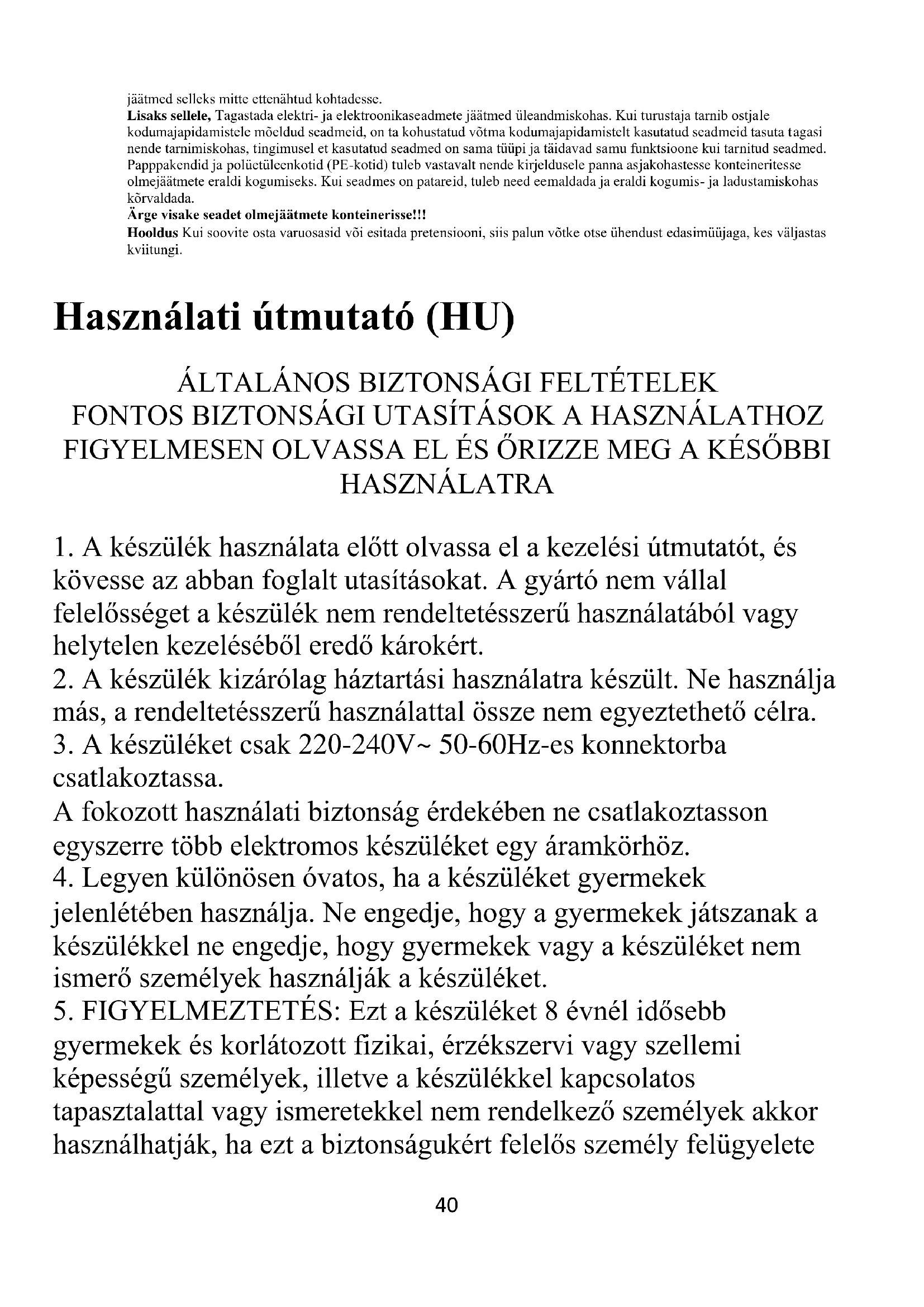 5. FIGYELMEZTETÉS: Ezt a készüléket 8 évnél idősebb