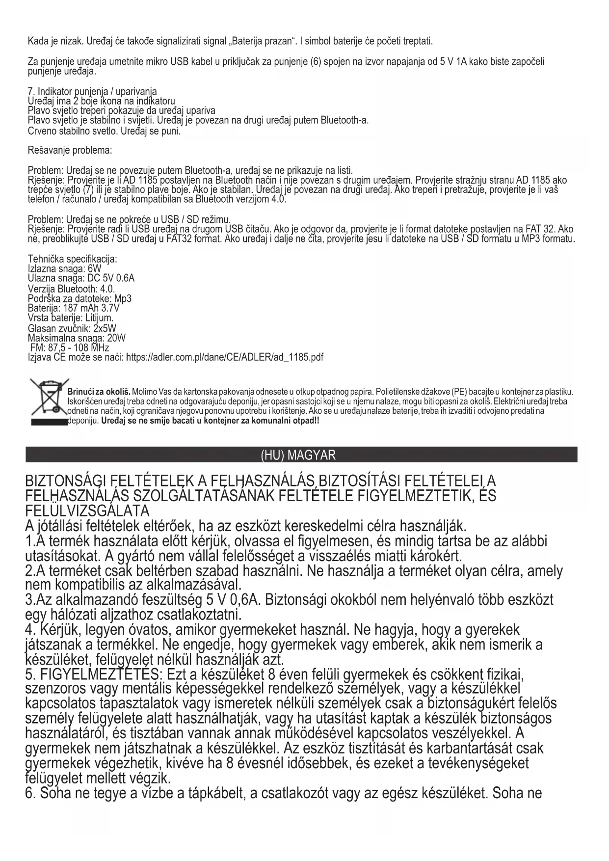 A készüléknek 2 ikonszíne van az indikátoron A villogó kék fény azt jelzi, hogy az eszköz párosul A kék fény stabil és világít. Az eszköz Bluetooth-on keresztül csatlakozik egy másik eszközhöz. Piros stabil fény. A készülék töltődik. Hibaelhárítás: Probléma: Az eszköz nem csatlakozik Bluetooth-on, az eszköz nem szerepel a listán. Megoldás: Ellenőrizze, hogy az AD 1185 Bluetooth-módban van-e beállítva, és nincs-e csatlakoztatva egy másik eszközhöz. Ellenőrizze az AD 1185 hátulját, ha a jelzőfény (7) villog vagy kék színű stabil. Ha stabil. Az eszköz csatlakoztatva van egy másik eszközhöz. Ha villog és keres, kérjük, ellenőrizze, hogy telefonja / számítógépe / készüléke kompatibilis-e a Bluetooth 4.0-s verziójával. Probléma: A készülék nem indul el USB / SD módban. Megoldás: Ellenőrizze, hogy az USB-eszköz működik-e egy másik USB-olvasón. Ha igen, akkor ellenőrizze, hogy a fájl formátuma FAT 32- re van-e állítva. Ha nem, akkor kérjük, formázza újra az USB / SD készüléket FAT32 formátumra. Ha az eszköz továbbra sem olvas, ellenőrizze, hogy az USB / SD fájlok Mp3 formátumban vannak-e. Műszaki specifikáció:Kimeneti teljesítmény: 6W Bemeneti teljesítmény: DC 5 V 0,6A Bluetooth verzió: 4.0. Fájl támogatás: Mp3 Akkumulátor: 1800 mAh, 3,7 V Elem típusa: lítium. Hangszóró: 2x5W Maximális teljesítmény: 20W FM: 87,5 - 108 MHz A CE-nyilatkozat megtalálható: https://adler.com.pl/dane/CE/ADLER/ad_1185.pdf Törődünk a természeti környezetért. Papír csomagokat kérünk adjanak át a papírhulladékra. Polietilén zacskókat (PE) dobjanak ki a műanyag tartályba. Kimerült gépe vissza kell adni a megfelelő taroló pontjához, mert a gépben levők veszélyes részek, veszedelmesek lehet a környezetnek. Az elektromos gép így kell visszaadni, hogy korlátozzon a re-használatát. Ha az elemek vannak a gépben, ki kell húzni ezeket és a visszakelladni külön tároló pontjához. (GR) ΕΛΛΑΔΑ ΠΡΟ CONΠΟΘΕΣΕΙΣ ΑΣΦΑΛΕΙΑΣ ΣΗΜΑΝΤΙΚΕΣ ΟΔΗΓΙΕΣ ΓΙΑ ΤΗΝ ΑΣΦΑΛΕΙΑ ΧΡΗΣΗΣ ΠΑΡΑΚΑΛΩ ΔΙΑΒΑΣΤΕ ΠΡΟΣΕΚΤΙΚΑ ΚΑΙ ΚΡΑΤΗΣΤΕ ΓΙΑ ΜΕΛΛΟΝ ΑΝΑΦΟΡΑ Οι όροι εγγύησης είναι διαφορετικοί, εάν η συσκευή χρησιμοποιείται για εμπορικούς