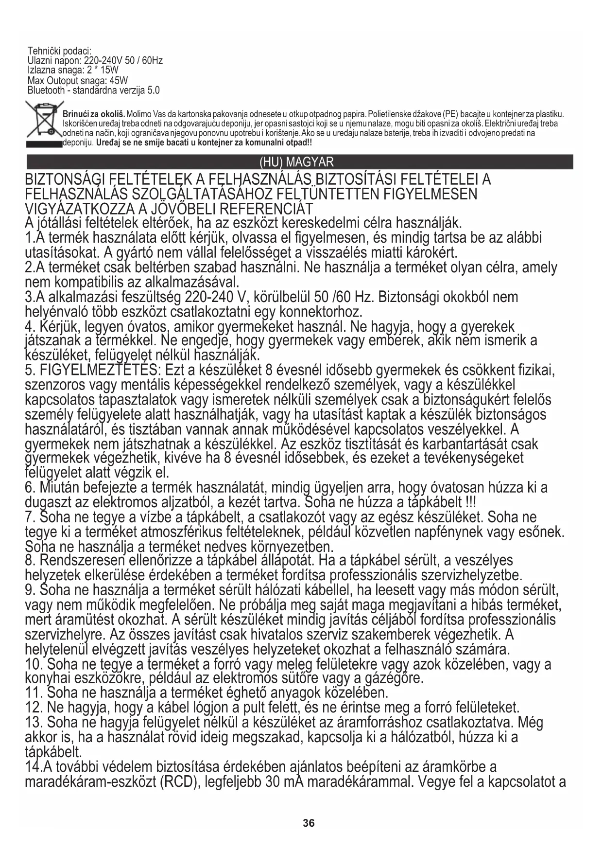 Tehnički podaci: Ulazni napon: 220-240V 50 / 60Hz Izlazna snaga: 2 * 15W Max Outoput snaga: 45W Bluetooth - standardna verzija 5.0 Brinući za okoliš. Molimo Vas da kartonska pakovanja odnesete u otkup otpadnog papira. Polietilenske džakove (PE) bacajte u kontejner za plastiku. Iskorišćen uređaj treba odneti na odgovarajuću deponiju, jer opasni sastojci koji se u njemu nalaze, mogu biti opasni za okoliš. Električni uređaj treba odneti na način, koji ograničava njegovu ponovnu upotrebu i korištenje. Ako se u uređaju nalaze baterije, treba ih izvaditi i odvojeno predati na deponiju. Uređaj se ne smije bacati u kontejner za komunalni otpad!! (HU) MAGYAR BIZTONSÁGI FELTÉTELEK A FELHASZNÁLÁS BIZTOSÍTÁSI FELTÉTELEI A FELHASZNÁLÁS SZOLGÁLTATÁSÁHOZ FELTÜNTETTEN FIGYELMESEN VIGYÁZATKOZZA A JÖVŐBELI REFERENCIÁT A jótállási feltételek eltérőek, ha az eszközt kereskedelmi célra használják. 1.A termék használata előtt kérjük, olvassa el figyelmesen, és mindig tartsa be az alábbi utasításokat. A gyártó nem vállal felelősséget a visszaélés miatti károkért. 2.A terméket csak beltérben szabad használni. Ne használja a terméket olyan célra, amely nem kompatibilis az alkalmazásával. 3.A alkalmazási feszültség 220-240 V, körülbelül 50 /60 Hz. Biztonsági okokból nem helyénvaló több eszközt csatlakoztatni egy konnektorhoz.