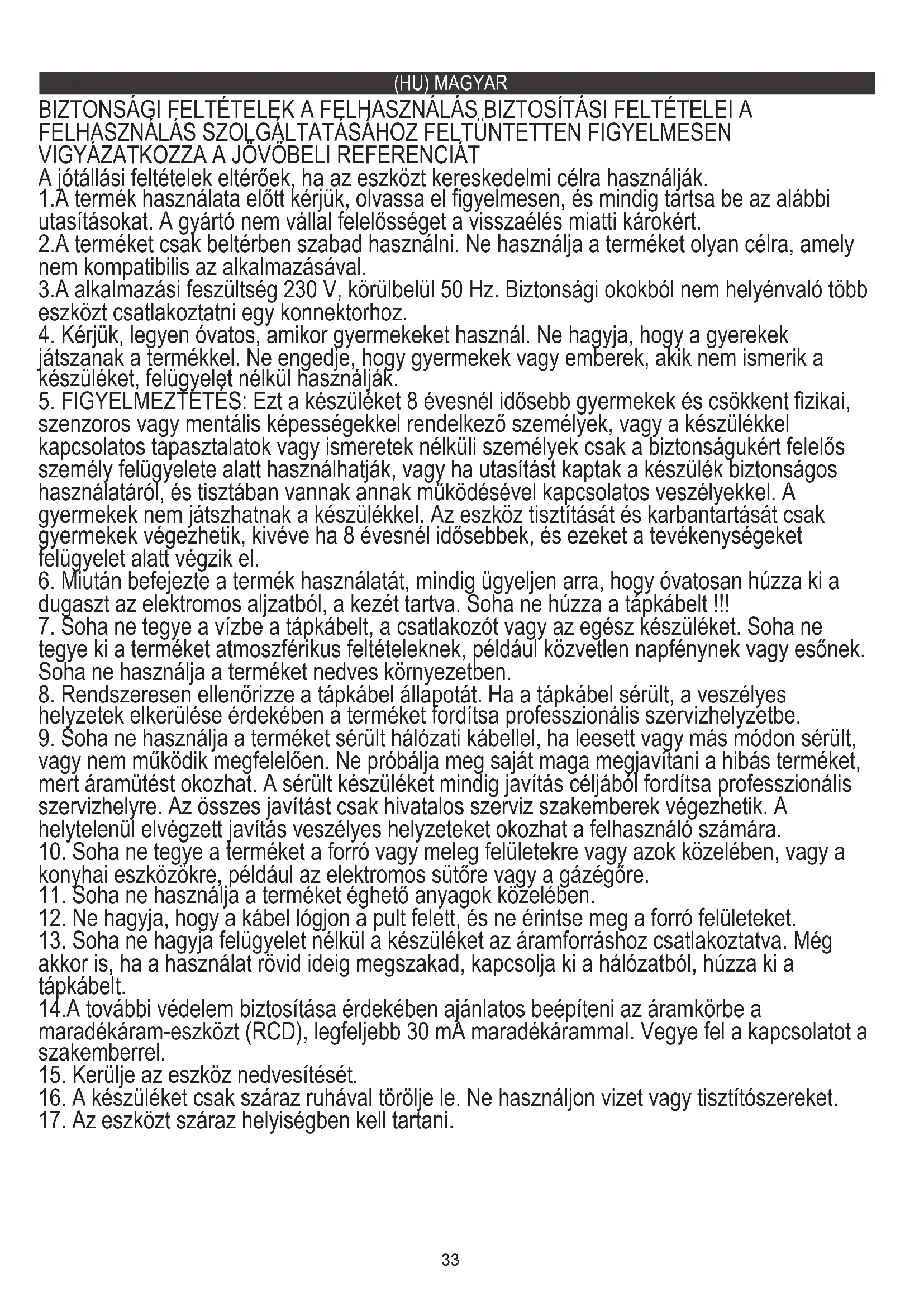 szenzoros vagy mentális képességekkel rendelkező személyek, vagy a készülékkel kapcsolatos tapasztalatok vagy ismeretek nélküli személyek csak a biztonságukért felelős személy felügyelete alatt használhatják, vagy ha utasítást kaptak a készülék biztonságos használatáról, és tisztában vannak annak működésével kapcsolatos veszélyekkel. A gyermekek nem játszhatnak a készülékkel. Az eszköz tisztítását és karbantartását csak gyermekek végezhetik, kivéve ha 8 évesnél idősebbek, és ezeket a tevékenységeket felügyelet alatt végzik el.