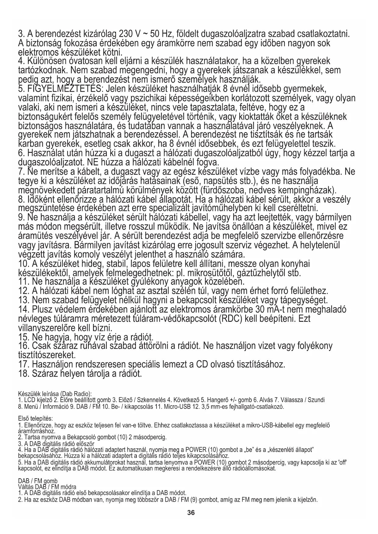 16. Csak száraz ruhával szabad áttörölni a rádiót. Ne használjon vizet vagy folyékony